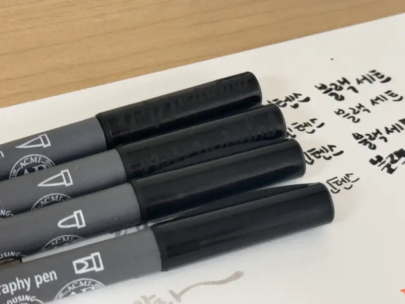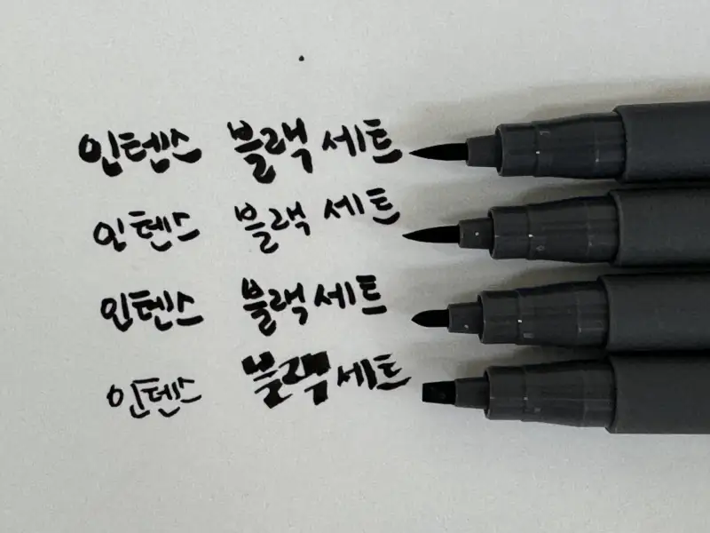맨 위에서부터 순서대로, 소프트 브러쉬펜 , 브러쉬펜 , 일반 팁펜 , 캘리그라피펜 입니다 👍🏻