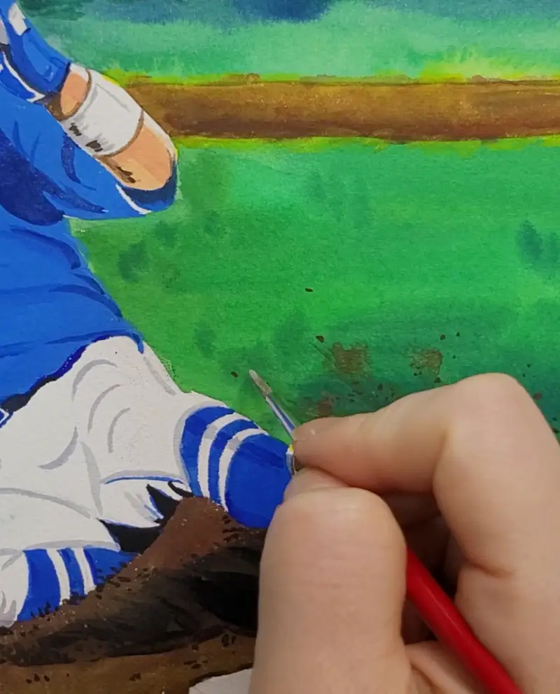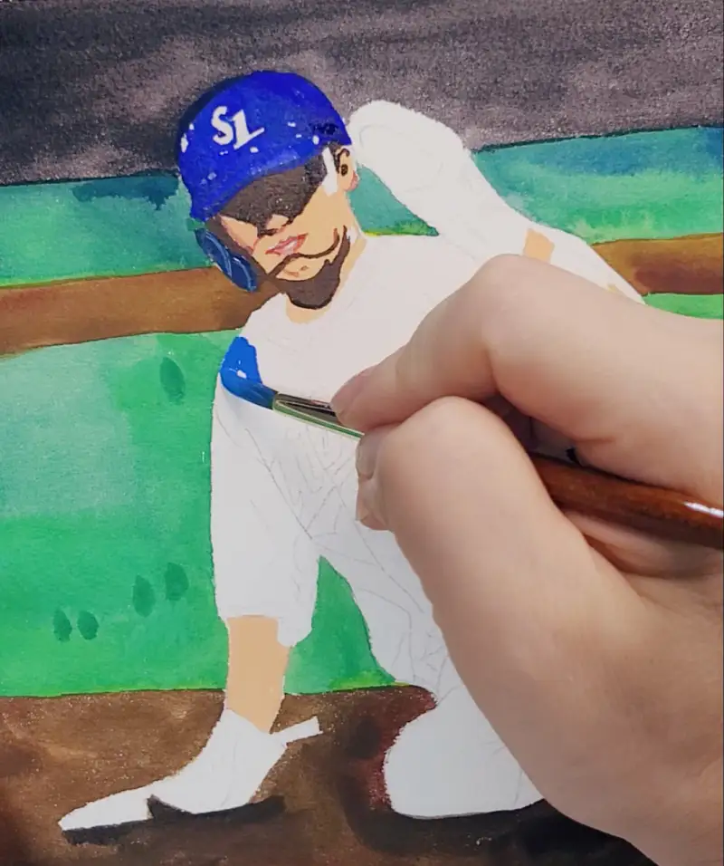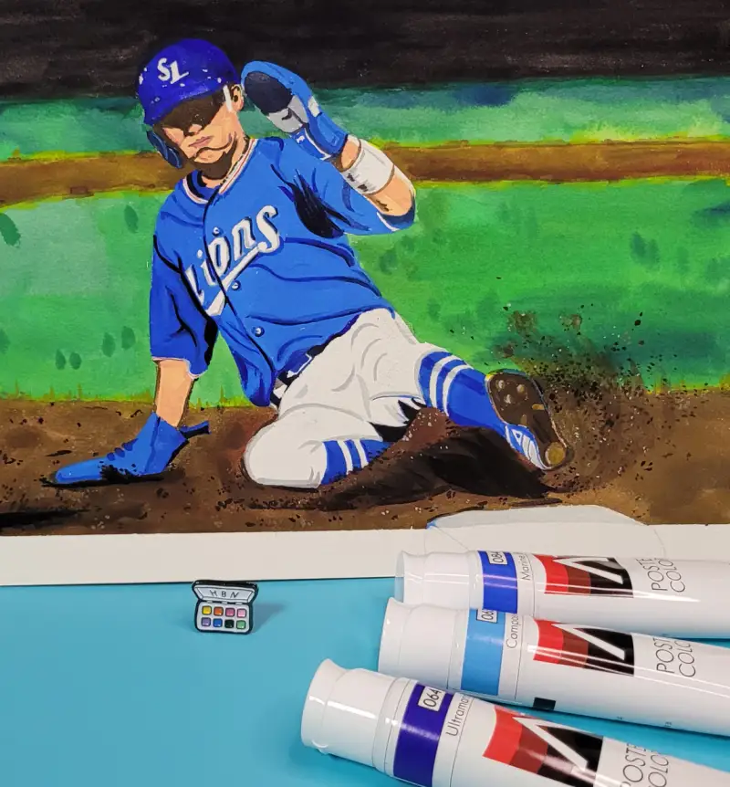 물감 본연의 발색이 주는 힘이 강해서 시원하고 생동감있는 색이 바로 드러나고 야구 특유의 역동성을 자연스럽게 담아낼수 있었늡니다.