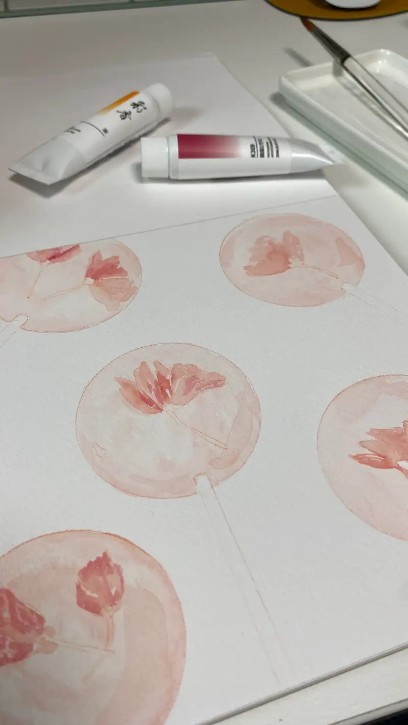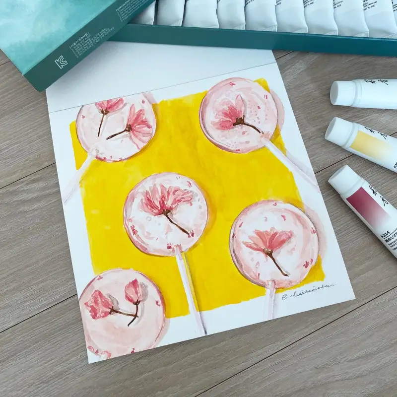 처음에 벗꽃 사탕 그림을 만들고 싶어서 분홍색 필요했고 K332(등)+K309(연지2)+K301(호분) 같이 섞었어요. 어떤 분홍색을 나오는지 잘 모르겠어요. 그런데 생각했던 것보다 진짜 예쁘고 잘 나왔더라고요! 보통 수채화 물감을 사용할 때 제가 원하는 분홍색이 그렇게 쉽지 나올 수 없어요. 보통 과슈 물감은 더 쉬워요. 그래서 이 채향 물감은 좀 과슈 특징을 가지고 있는 생각도 둘어왔어요.