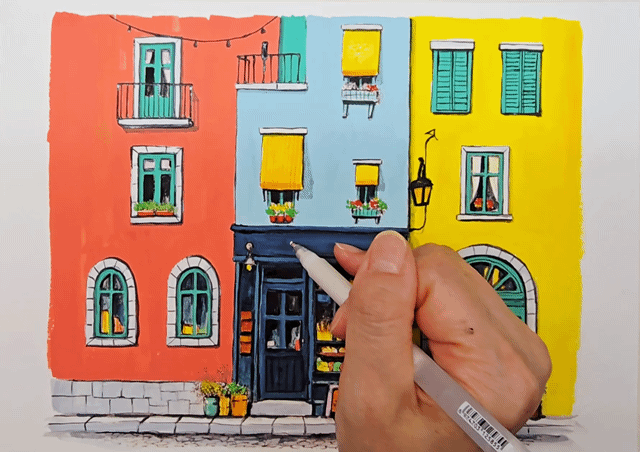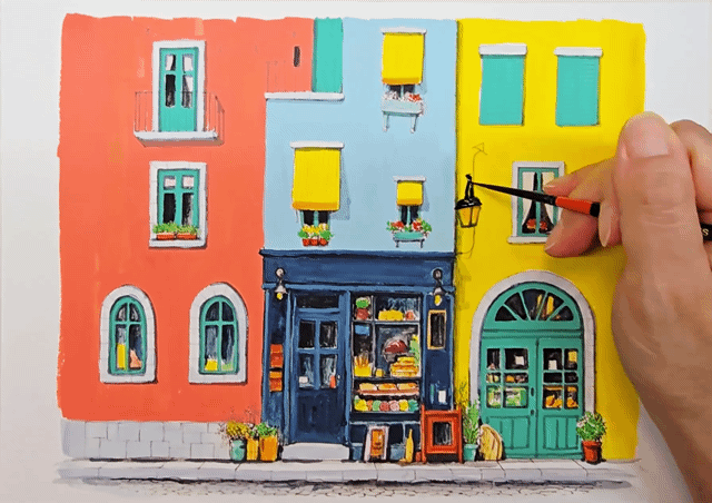 매트한 질감에 선명한 발색이 매력적이라 건물에 페인트칠을 하듯 상점 그리기를 해봤습니다.