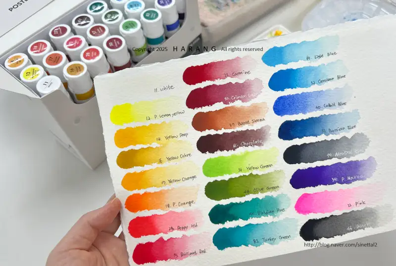 발색 후 테스트를 해봤는데 수채화물감처럼 물양으로 농도 조절도 되고 다른색과 조색도 잘되고 두가지색 이상