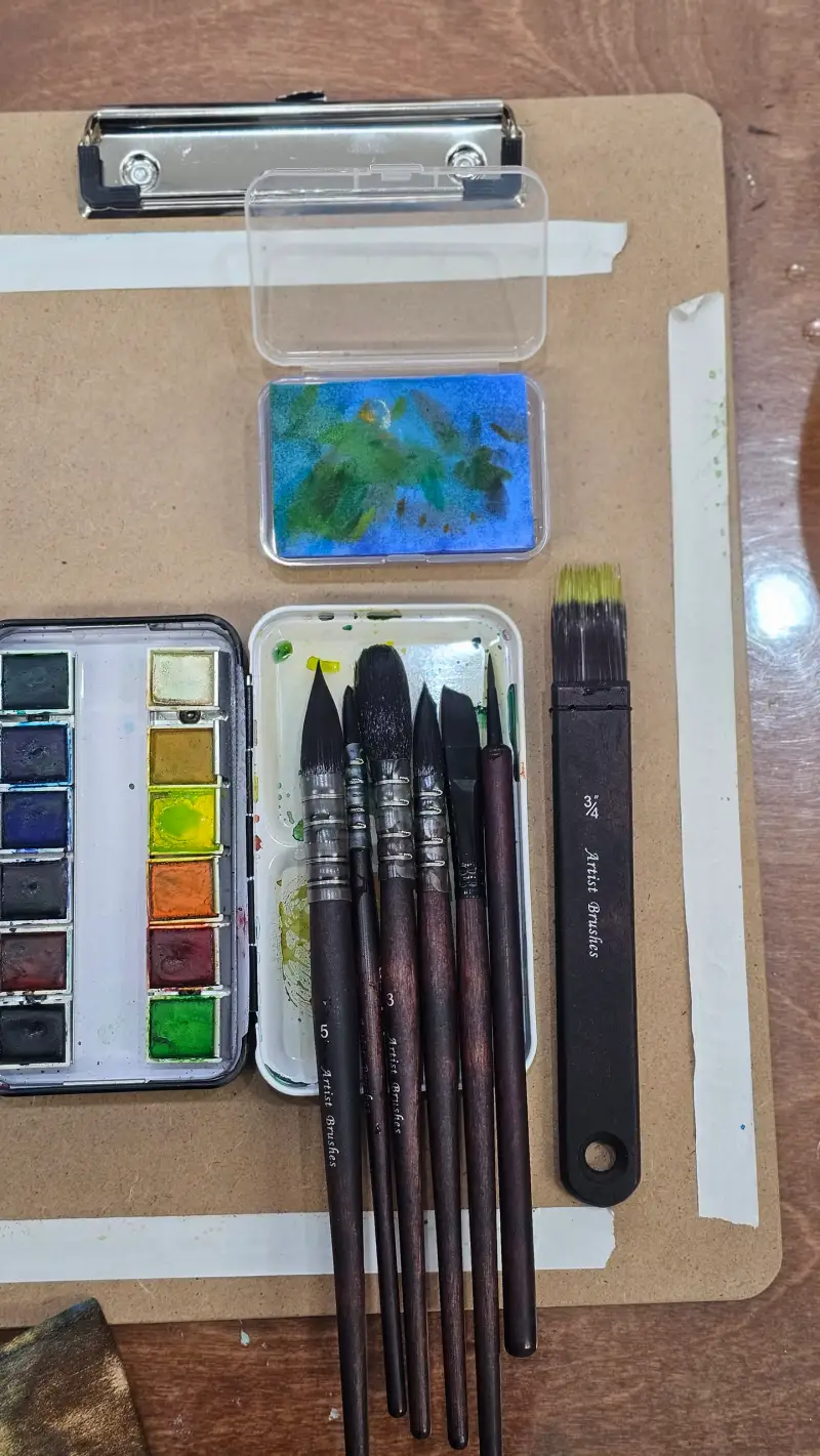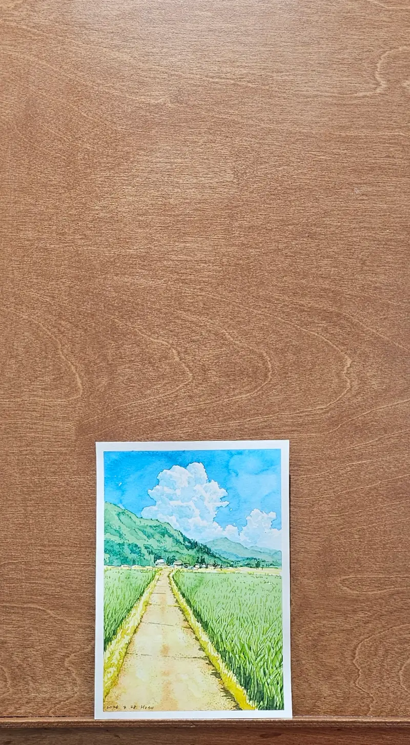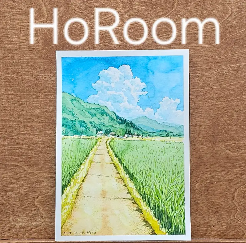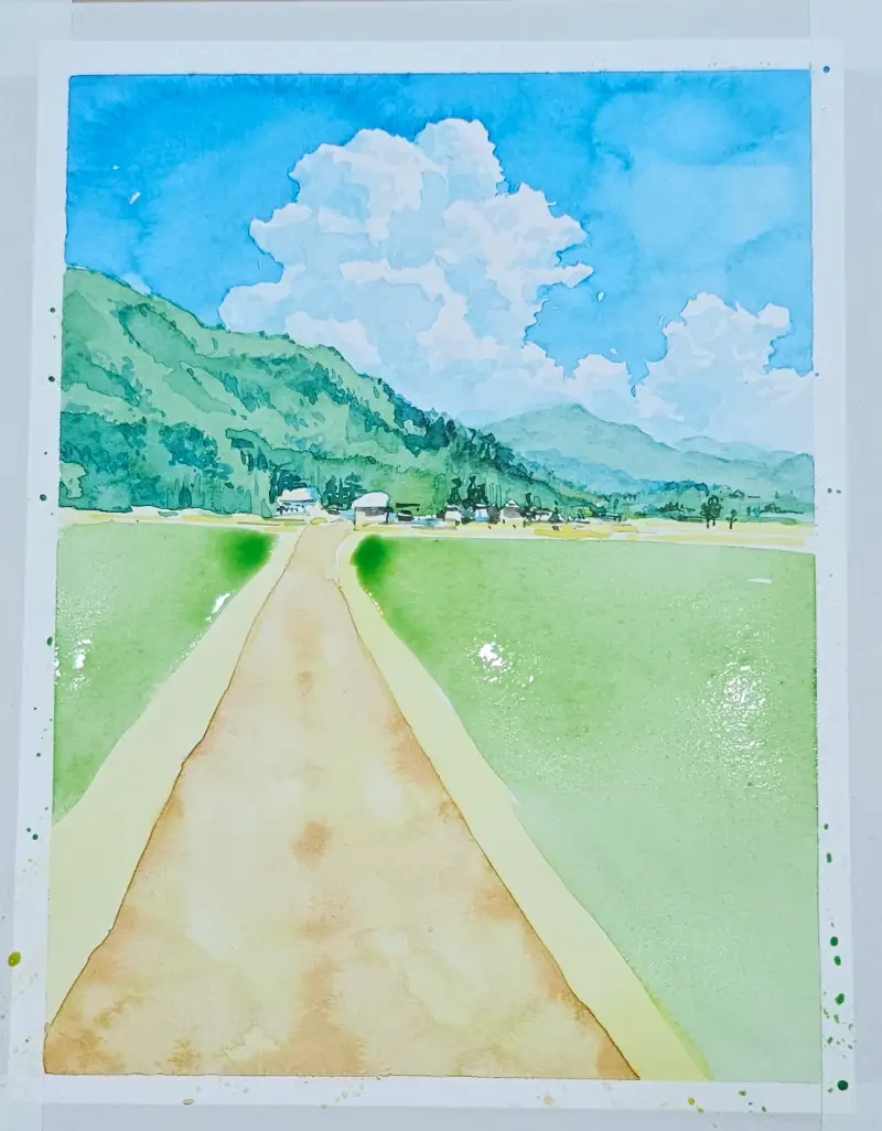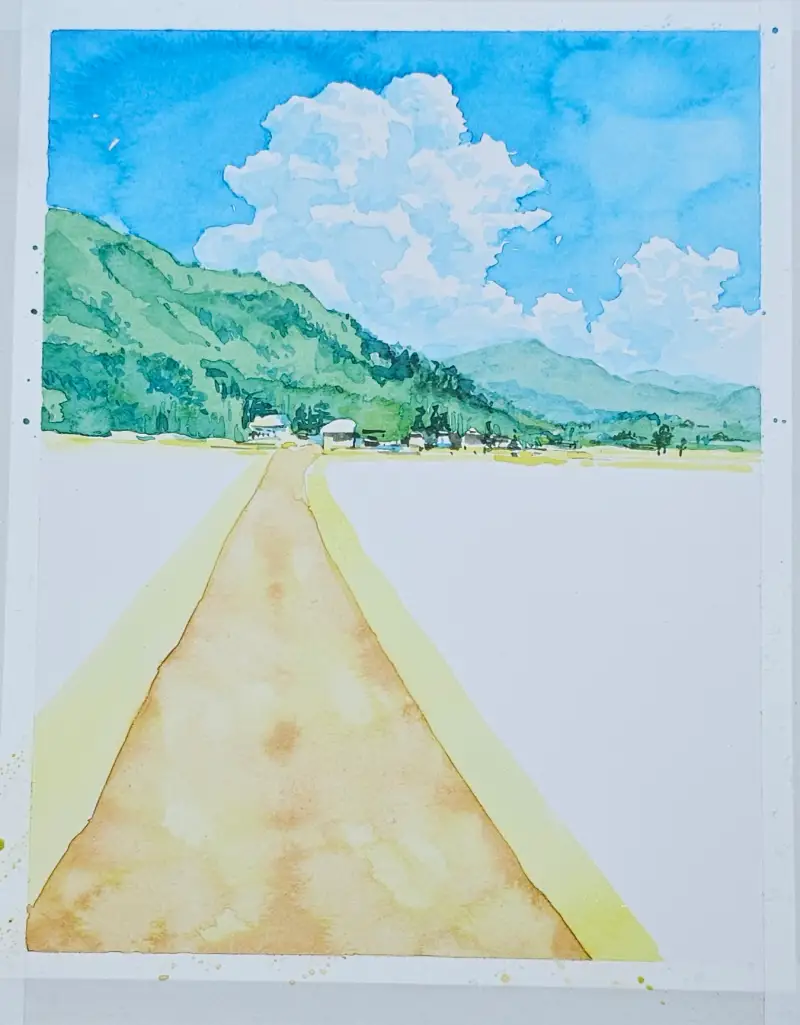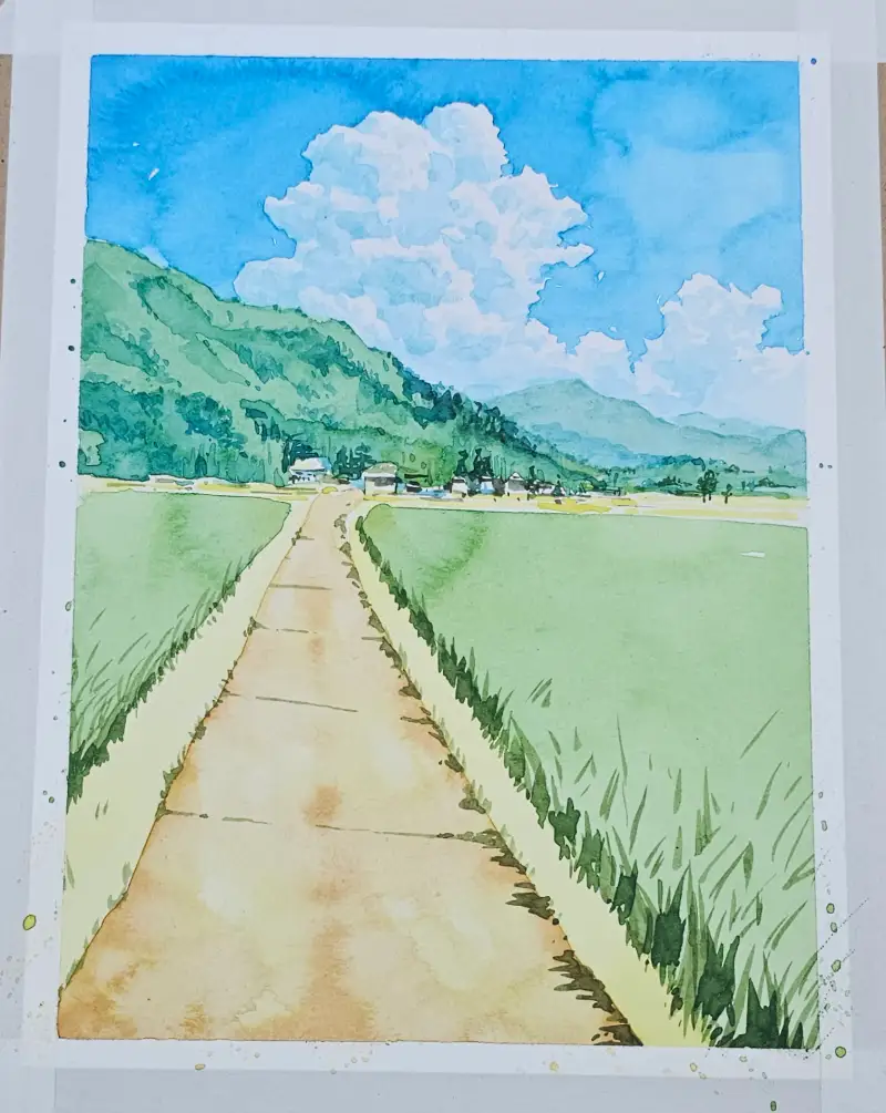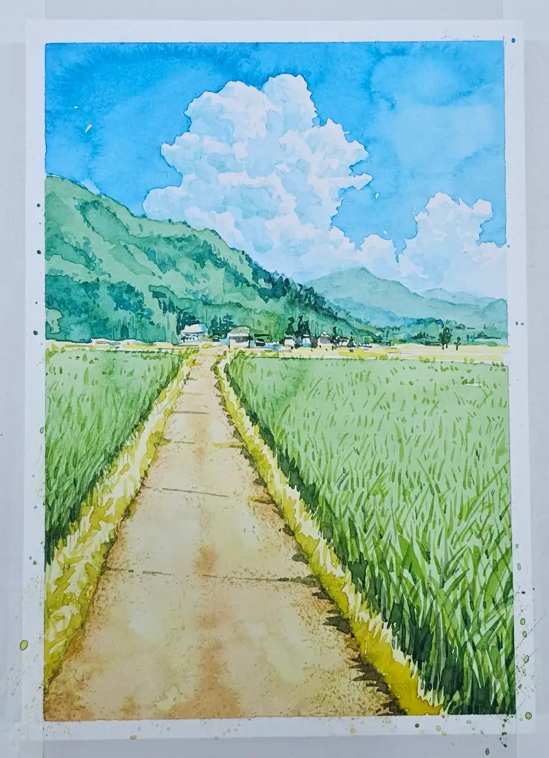 맑은 하늘 뭉게구름과 초록초록한 논밭의 풍경을 수채로 맑게 그려보았습니다 :)
