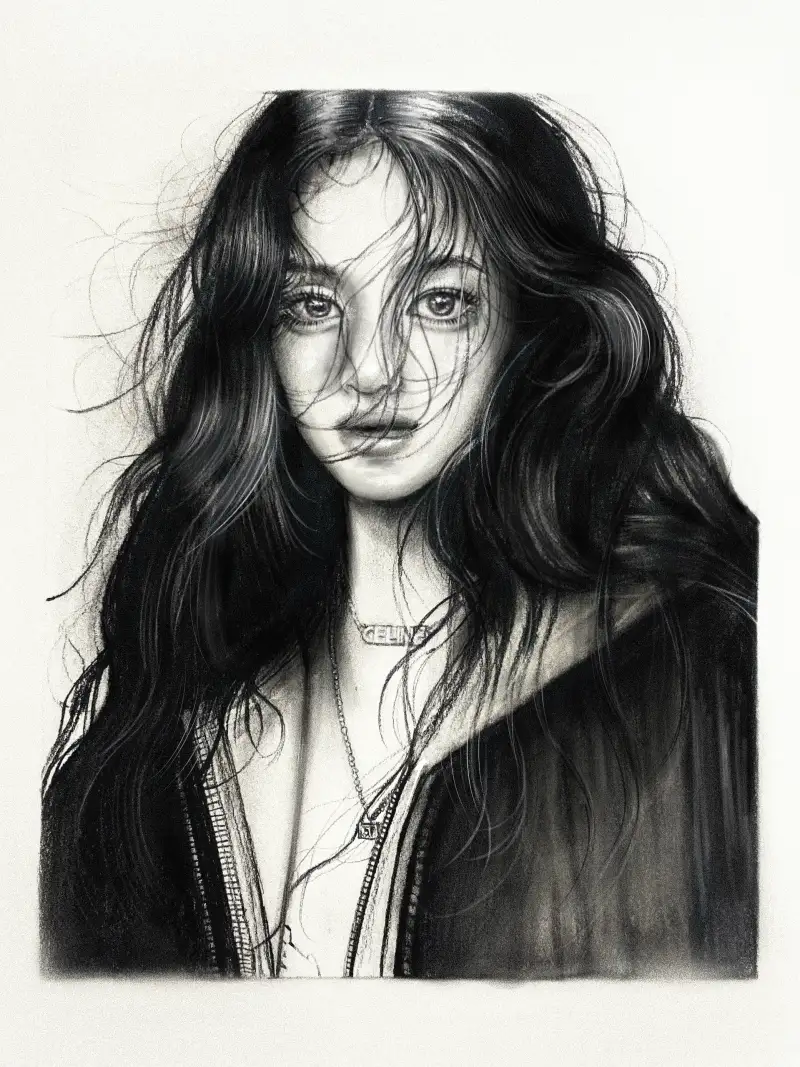 스케치북에 톰보우HB 연필로 밑그림 및 적절한 그림자를 넣고 파버카스텔14B로 진하게 머리카락을 칠했습니다. 전동지우개와 지우개로 하이라이트를 표현해주었습니다.