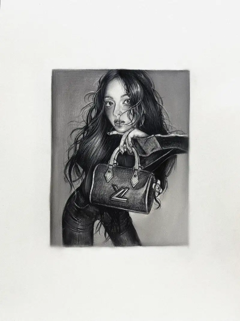 스케치북에 톰보우3H 연필로 밑그림을 그리고 톰보우HB와 톰보우 2B로 적절한 그림자를 넣어준 뒤 파버카스텔14B로 진하게 머리카락을 칠했습니다. 전동지우개와 지우개로 하이라이트를 표현해주었습니다.