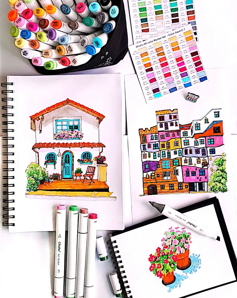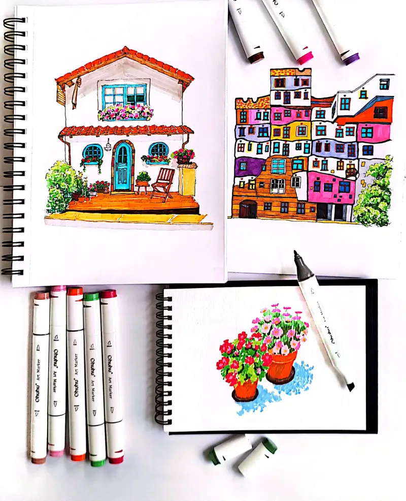 듀얼 펜타입이라 섬세한 부분부터 넓은 면까지 채색을 할수 있고, 잉크가 뭉치지 않고 매끄럽게 퍼지면서 두가지 색을 섞거나 그라이데이션을 할때 번짐없이 자연스럽게 명암 표현이 잘 됩니다.