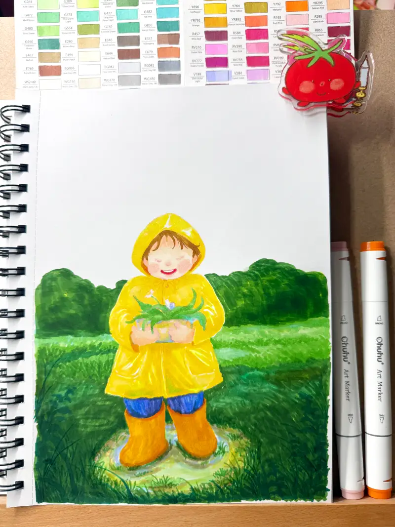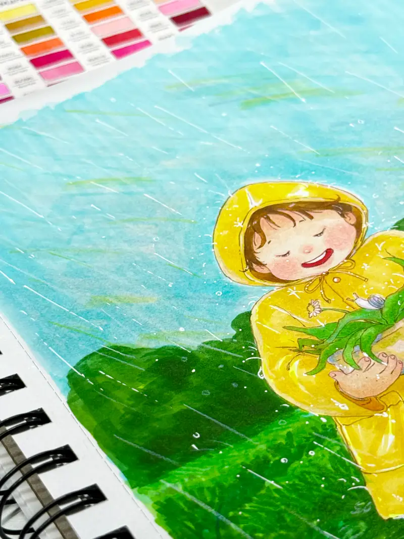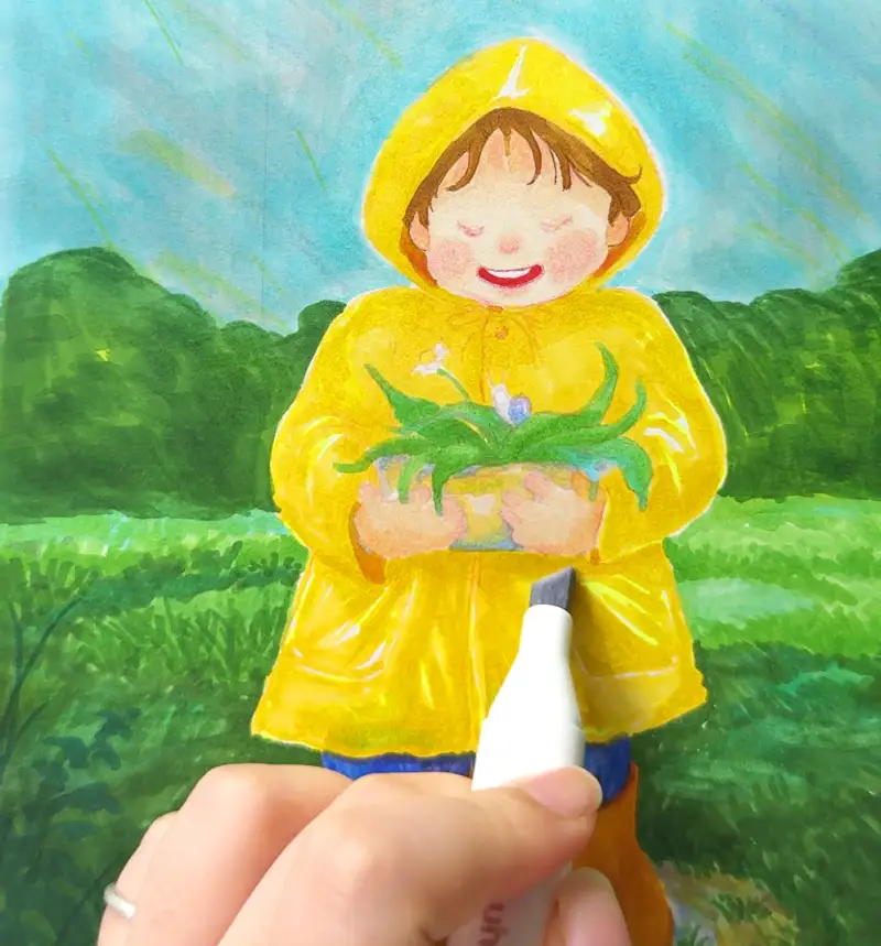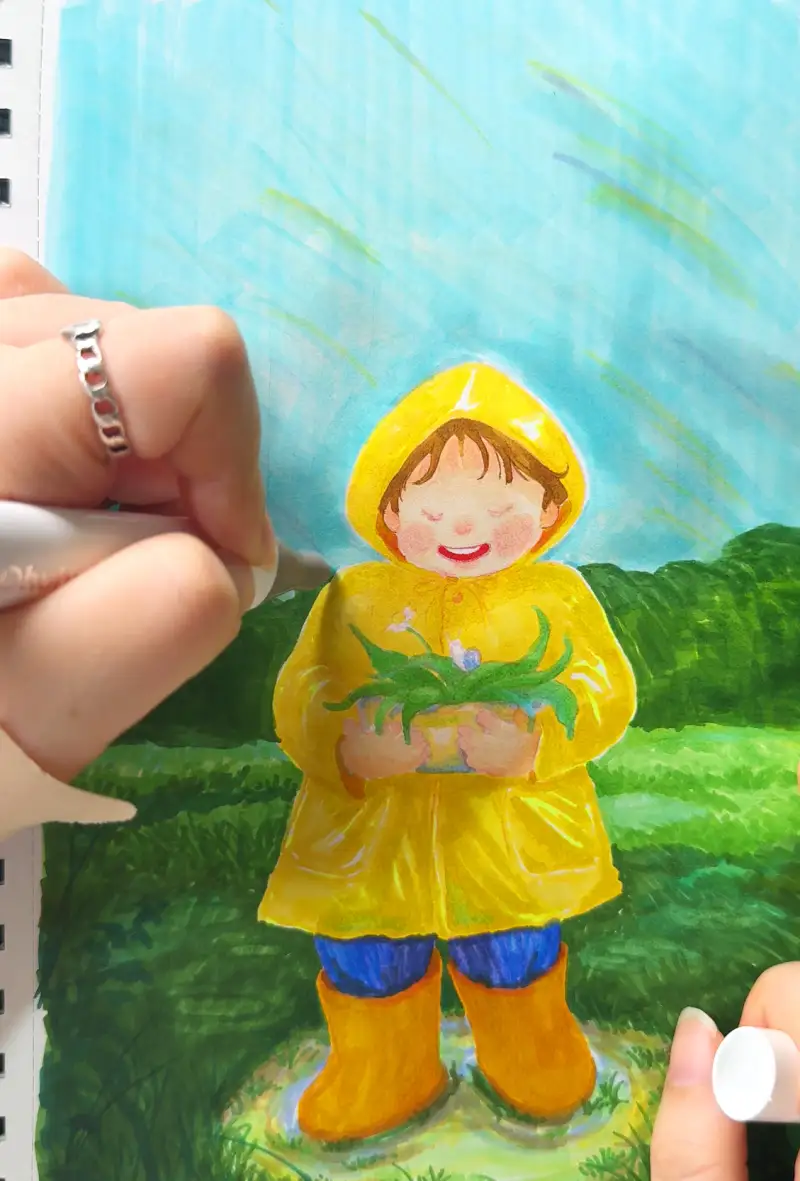 맑은 느낌을 잘 표현할 수 있는 우비를 입은 아이와 비오는 날을 그려봤는데요.