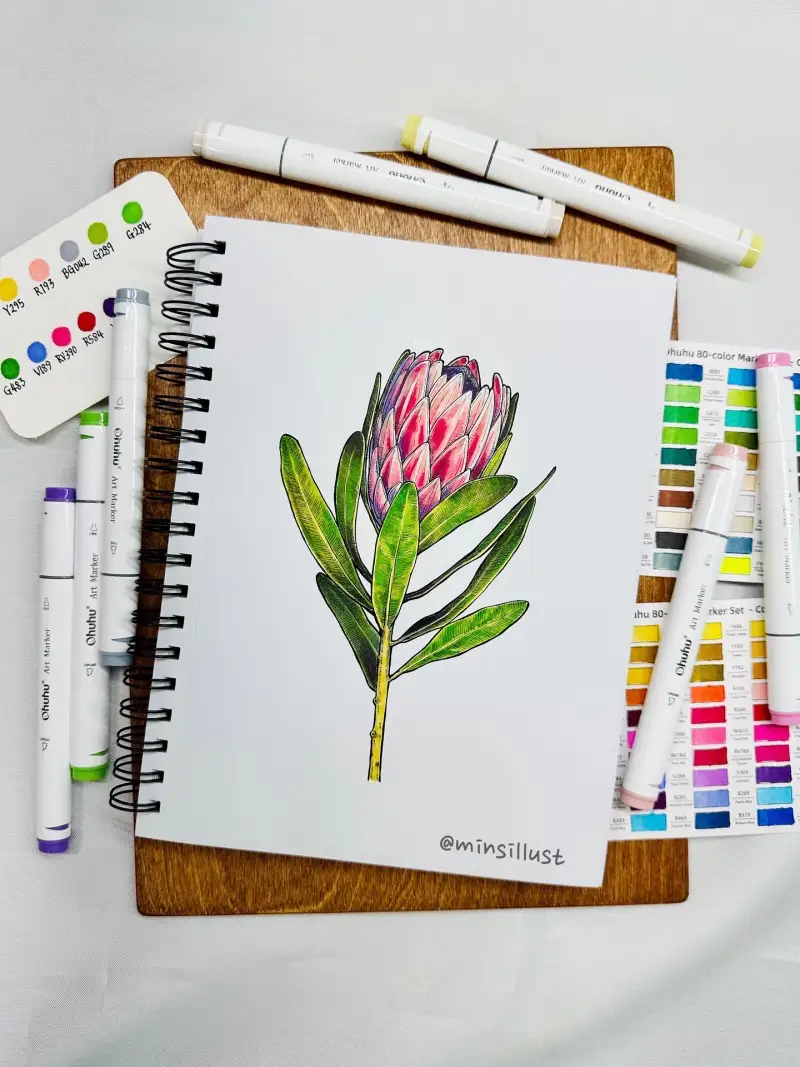 제가 좋아하는 꽃 🌺 프로테아를 펜 드로잉 후 오후후 트윈마카로 채색해 보았어요.