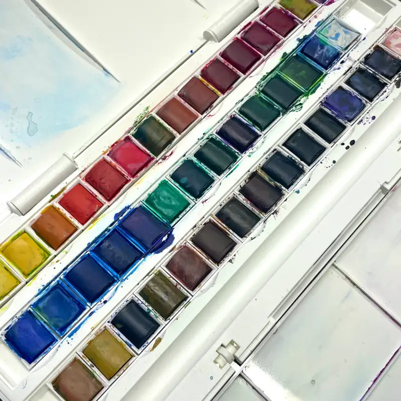 원래 수채화물감을 파렛트에 짜서만 써봤지, 고체물감은 처음 써보는데 재밌는 경험이었습니다~!