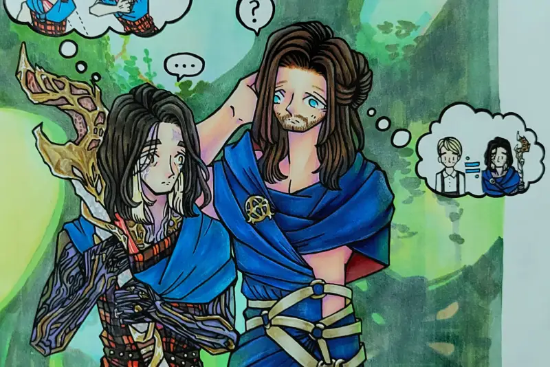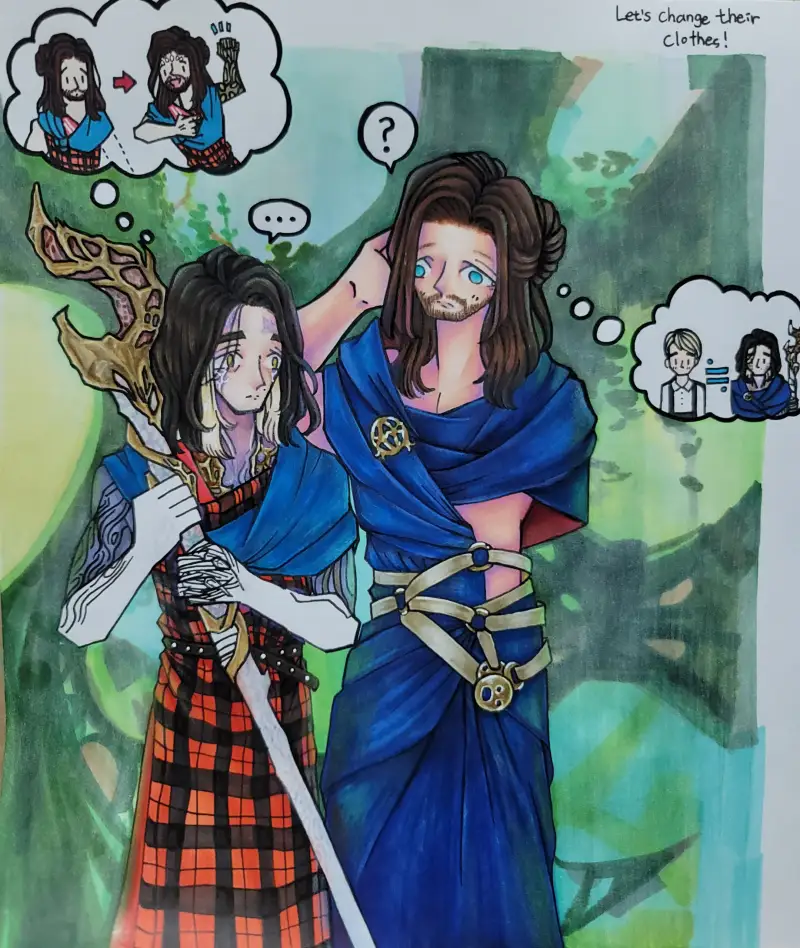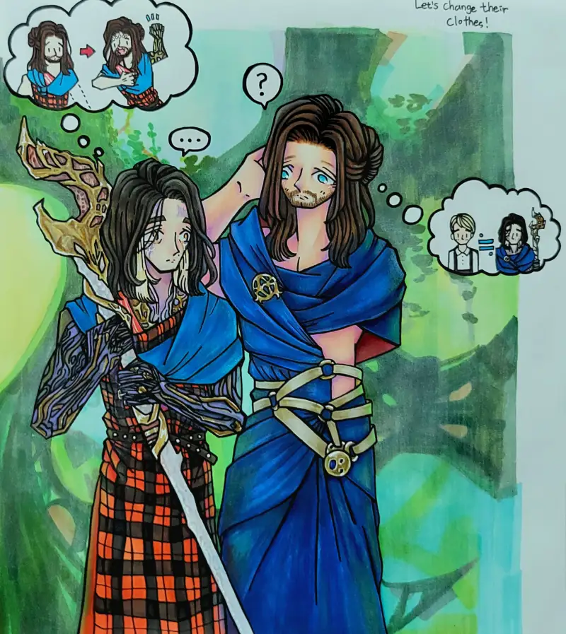 제가 최근에 가장 좋아하게 된 작품의 최애 캐릭터와 예전부터 지금까지 꾸준히 좋아하는 최애 캐릭터를 함께 그리며 두 캐릭터의 옷을 바꿔 그려보았습니다.