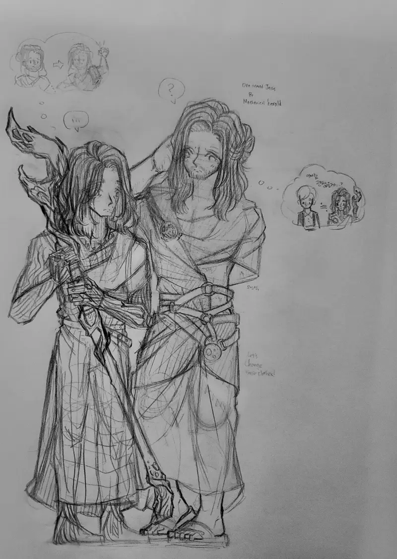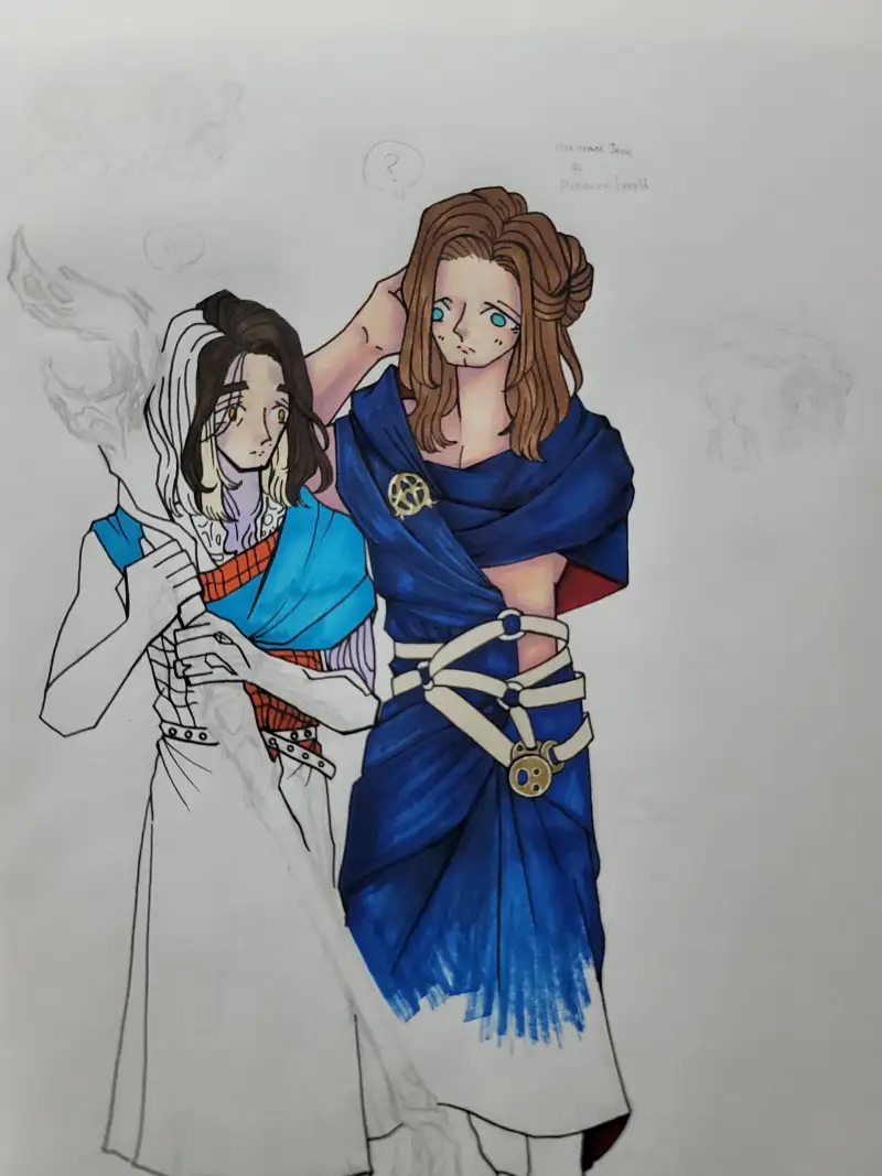 처음 러프 스케치를 찍은 사진 입니다. 제가 가장 좋아하는 캐릭터들을 서로 만나게 해서 옷을 바꿔입혀 그리면 어떨까? 라는 재미삼아 떠올린 것을 표현했는데, 채색과 완성도 하면 좋을 것 같아 마카 전용지에 끄적인 것입니다. 오른쪽에 있는 인물이야 작성 연도 기준으로 거의 10년 동안 좋아해 오면서 그리는데 익숙해져 스케치가 쉬웠지만, 왼쪽의 인물은 올해 초에 좋아하기 시작한 작품에 처음 그린 캐릭터라 스케치 하는데 애를 먹어서 선이 많이 더러워진 기억이 나네요😅