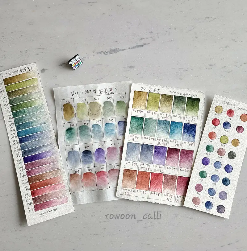 길상안채 채미먹 물감을 받고 제가 평소 많이 쓰는 수채화와 화선지에 발색표를 만들어 보았어요