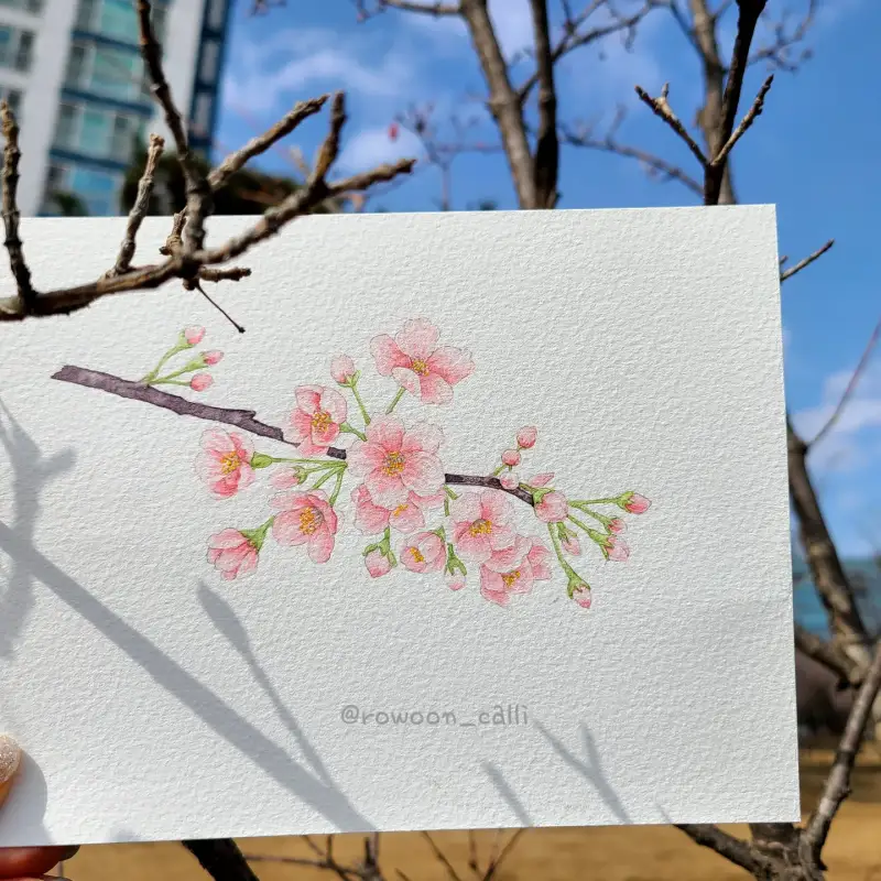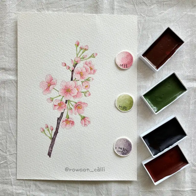 벚꽃을 그려 보았어요. 발색을 할 때 부터 308 묵홍이 벚꽃같다고 느껴졌는데 역시나 예뻐요.