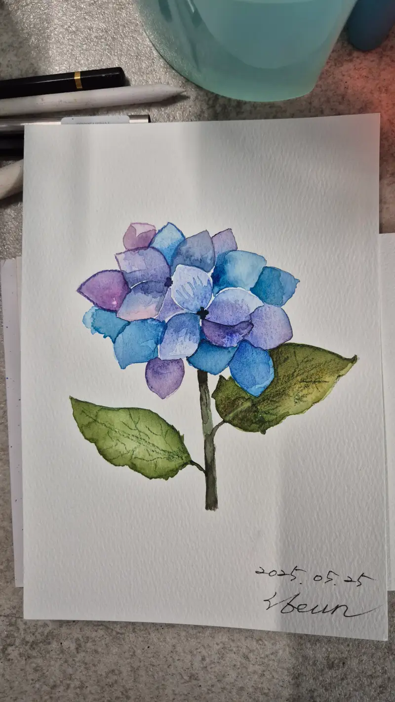 색연필로 꽃 그린 적은 있는데 수채화로는 처음 그렸습니다. 물 양을 신경쓴다고 했는데도 색이 탁하게 나온 듯 합니다. 유성색연필로 세밀한 부분은 마무리 했습니다. 재밌네요~