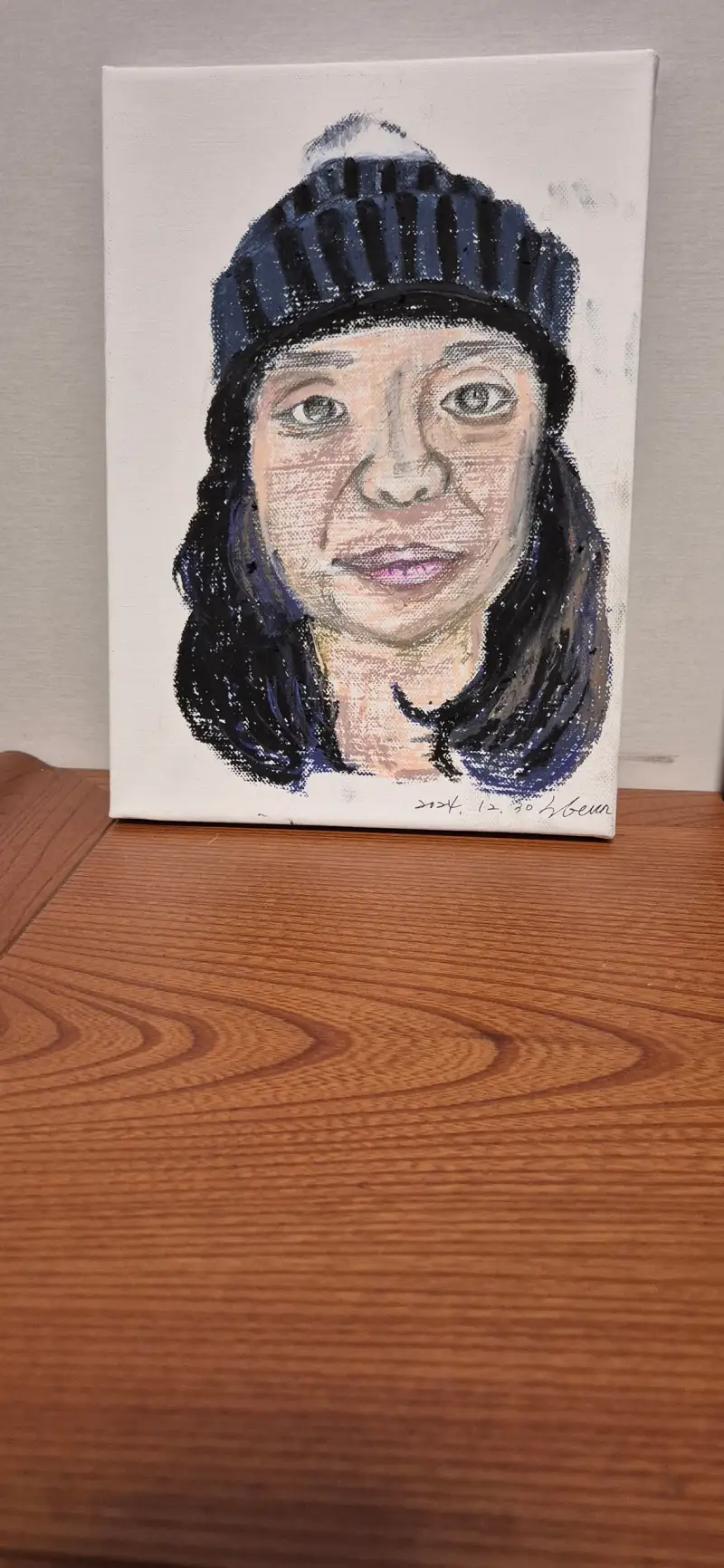 캔버스에 친동생 얼굴을 그렸습니다. 재료는 소프트 오일파스텔과 유성색연필입니다. 새벽까지 지 생각하면서 심혈을 기울여 그렸건만 돌아온 대답은 '마귀할망 같아'였습니다. 지 얼굴 그려보라 할 때는 언제고. 못된 지지배!