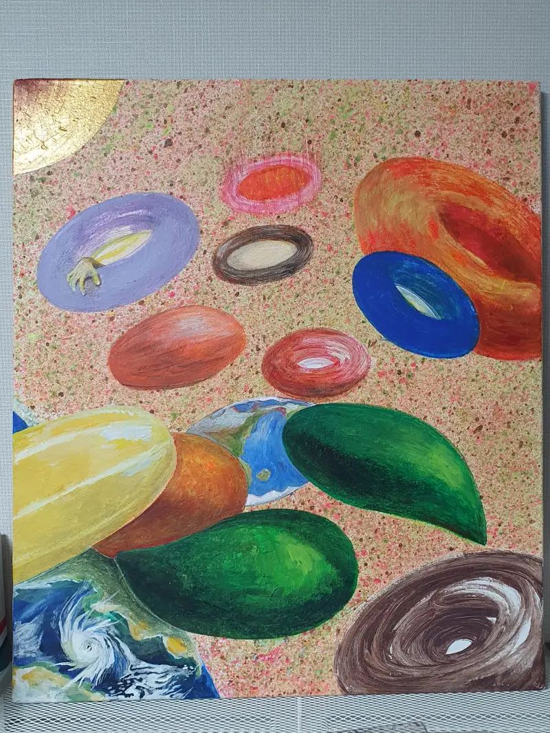 작업은 몽마르트 아크릭 물감, 칫솔, 초등학생용 붓