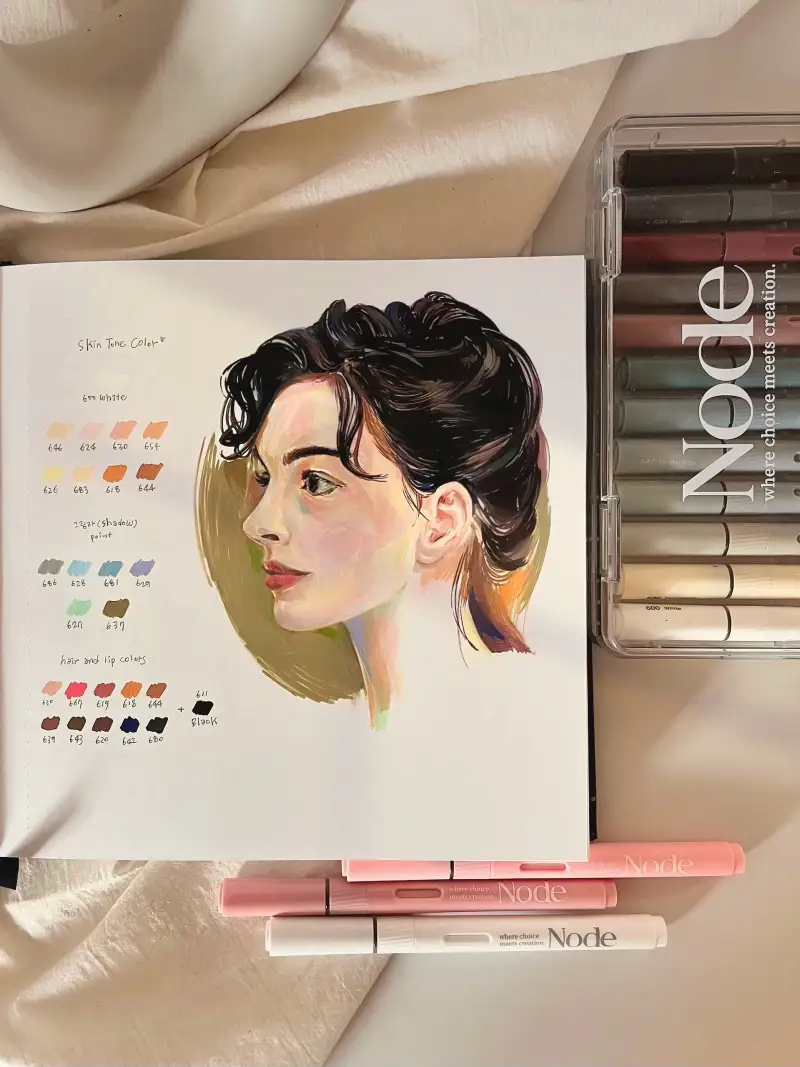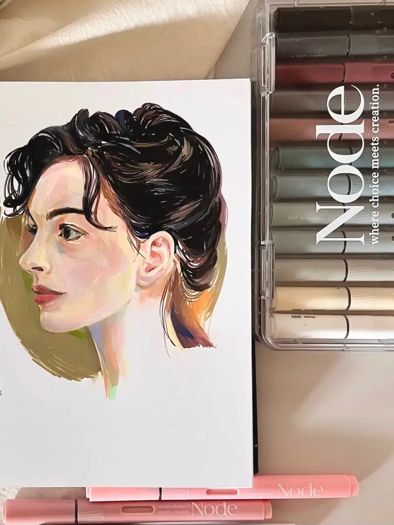 72색상 발색이 다 너무 예쁘지만 특히 스킨톤이 예쁘게 나와서 인물화 채색도 가능하더라구요🤍 아크릴마카만으로 작업했지만, 다음엔 아크릴물감이나 과슈로 배경 채색 후 위에 마카 작업을 해도 좋을 것 같아요:)