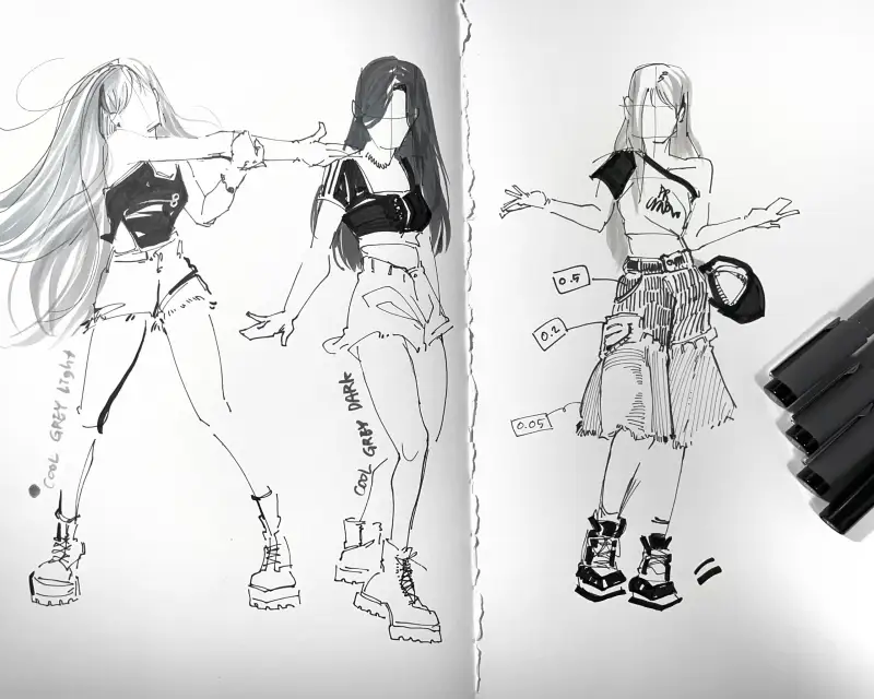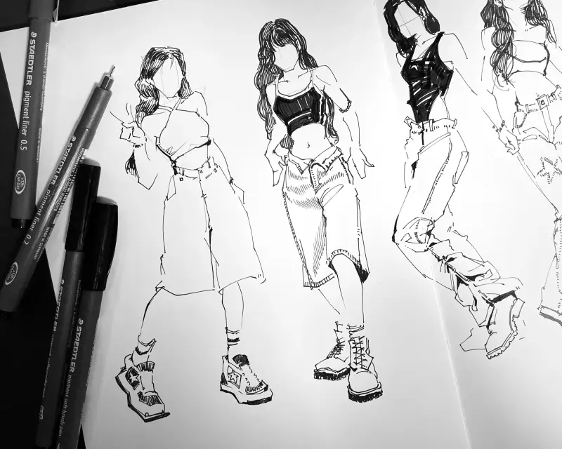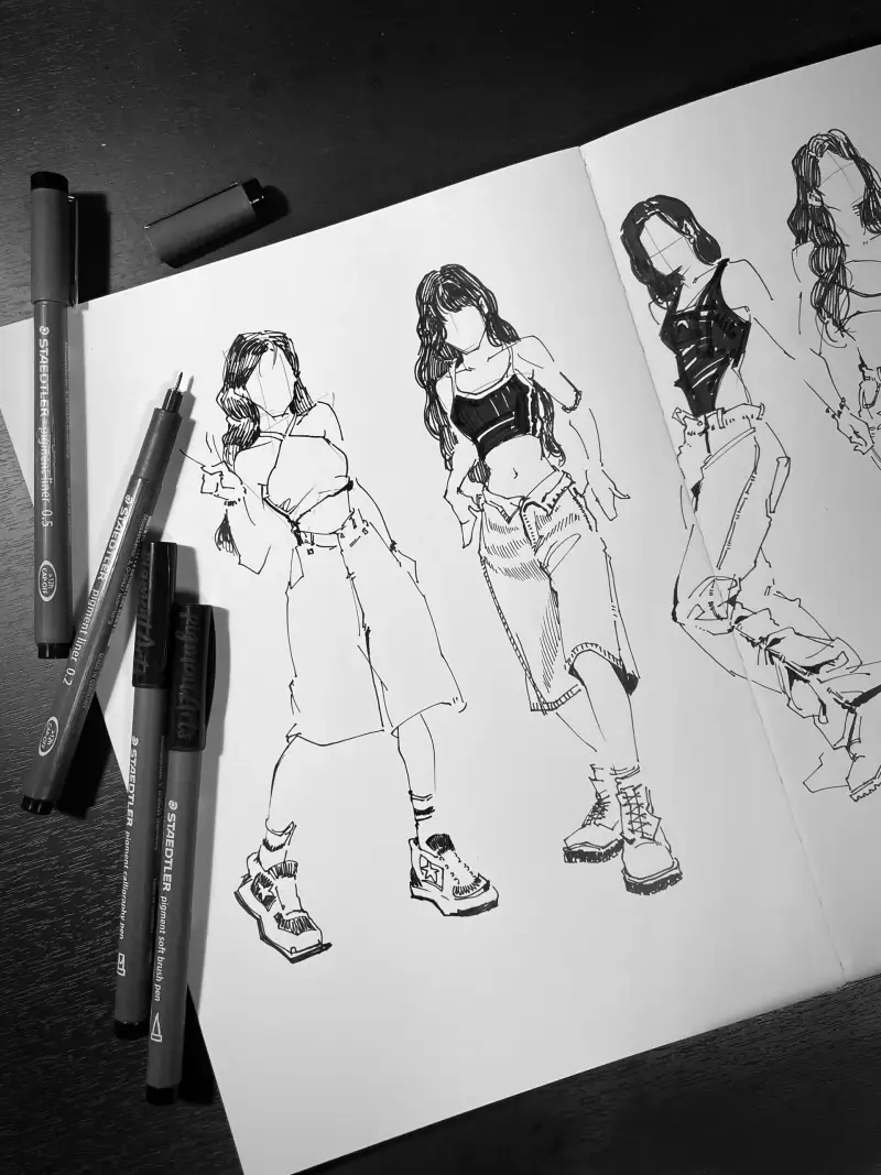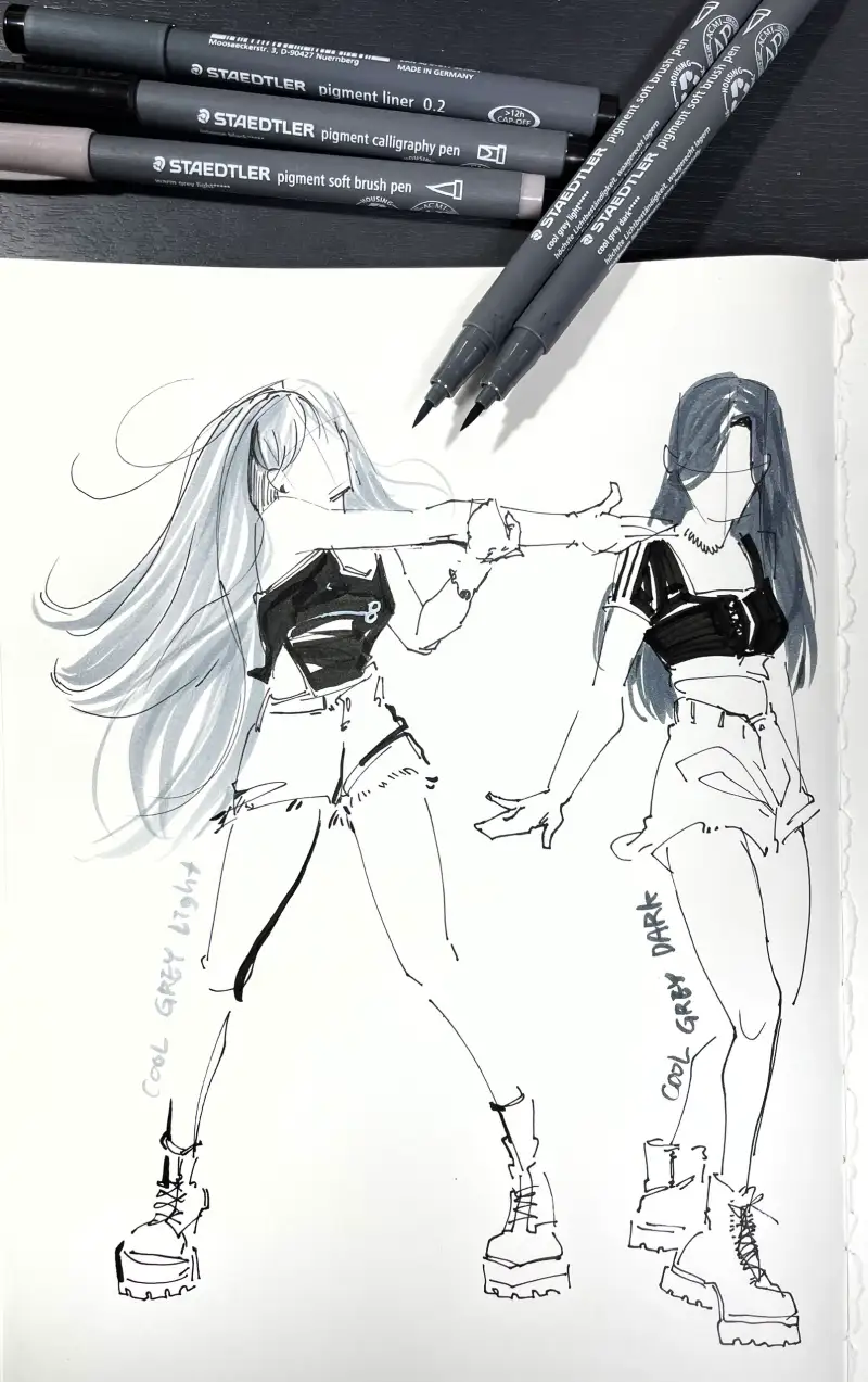 스테들러 피그먼트 라이너 0.2mm와 0.5mm를 이용해 이번에 활동하는 아이돌의 룩북을 그려봤습니다.