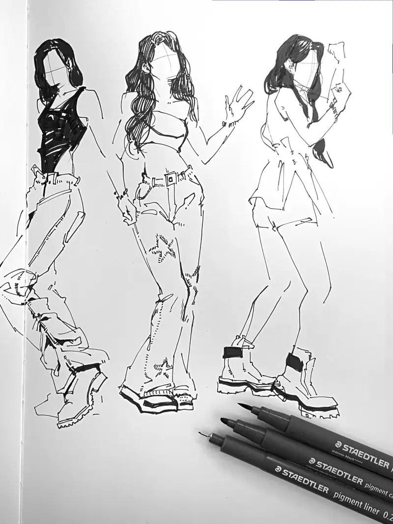 복잡한 신발과 재질감이 돋보이는 청바지의 경우, 펜심의 두께 선정이 중요한데요. 자칫 잘못하면 의상의 재질감이 두꺼워보이거나, 둔탁하게 표현되기 쉽기 때문입니다. 특히 연필과 달리 수정이 어렵기 때문에 매 번 선을 그을 때마다 조심스러울 수 밖에 없는데요. 스테들러 피그먼트 아트펜은 0.05mm부터 0.8mm까지 다양한 선택지가 있어서 그리기 전, 이리저리 테스트 해 볼 수 있답니다.