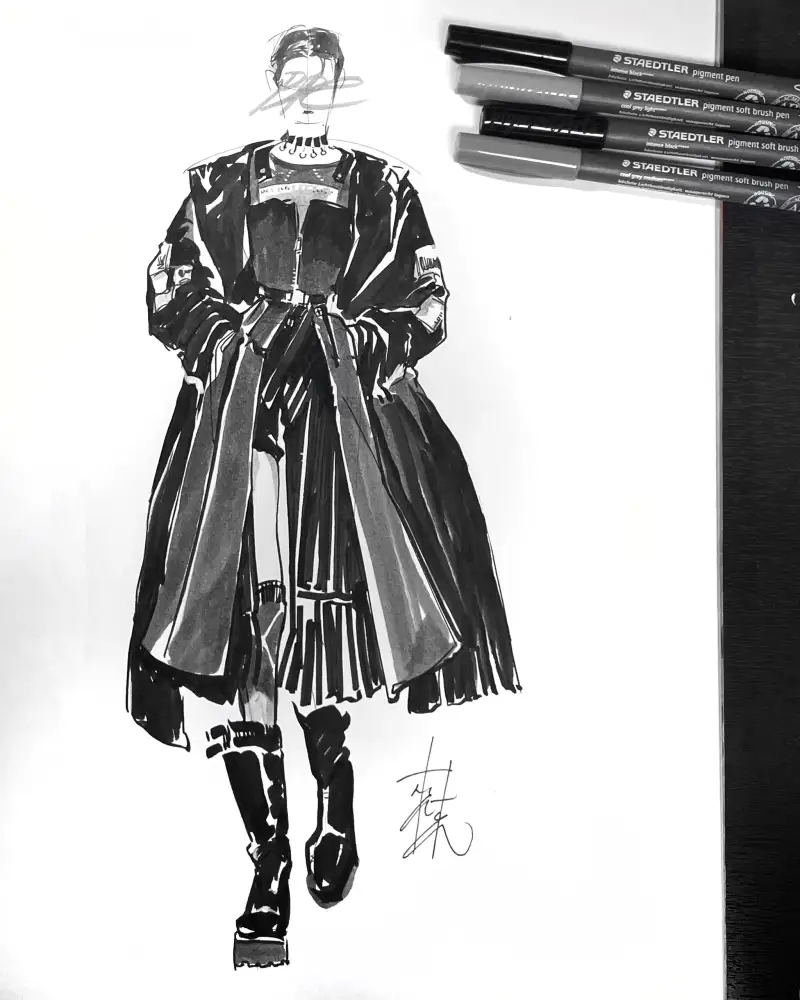 룩북하면 런웨이가 빠질 수 없죠. 시원시원한 선의 느낌을 좋아하기 때문에, 항상 a3사이즈의 큰 드로잉북을 선호하는데요. 가장 먼저 접하게 되는 피그먼트 라이너 제품의 경우, 사이즈가 다양하지만 주로 a5의 사이즈의 그림을 그릴 때 사용해 아쉬움이 있었답니다. 스테들러 피그먼트 캘리그라피펜은 브러쉬 팁이 종이에 맞닿게 기울어져도 잉크가 막힘없이 잘 나와서, 오랜만에 큰 종이에 펜으로 그릴 수 있었습니다.