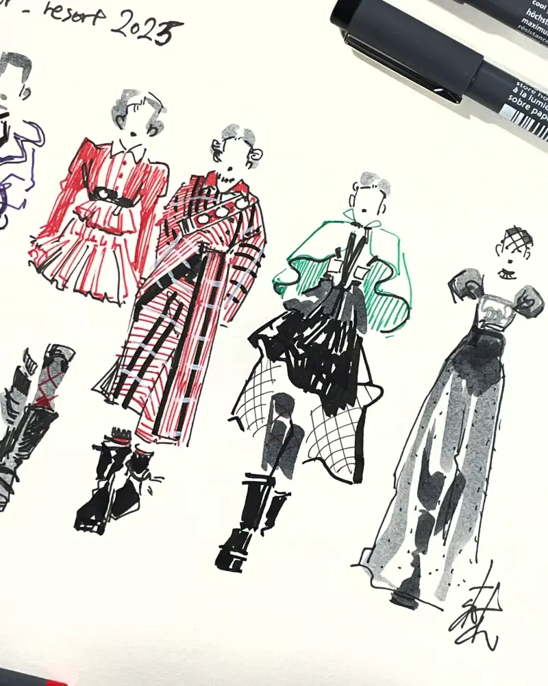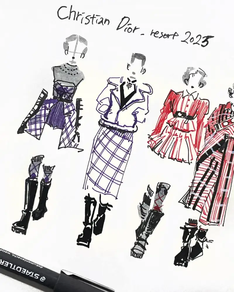 저는 손 끝에 힘을 많이 주는 편인데요. 0.5mm 이하의 얇은 펜들은 종종 사용하다보면 심의 끝 부분이 잘못 들어가서 사용을 못하게 되곤 했답니다. 그래서 사실 작은 사이즈의 그림을 얇은 펜으로 그리는 걸 무서워했는데요. 스테들러 피그먼트 라이너는 어느 각도에서 그려도 막힘없이 잘 나오는 편이라 거의 처음으로 미니 룩북 시리즈를 그려봤습니다. 이번 디올의 쇼에서 특히 체크무늬와 가죽소재를 이용한 의상들을 많이 선보였는데요. 라이너 컬러 뿐 아니라 0.05mm의 작은 검정 펜과 브러쉬펜까지 합쳐지니, 제가 보고 느낀 의상의 포인트들만 담아볼 수 있어 즐거웠습니다.