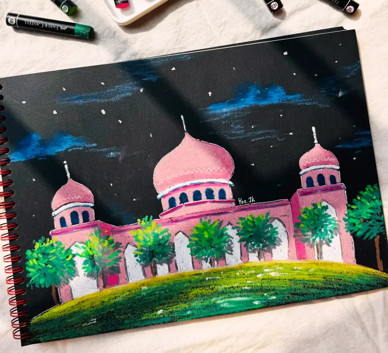 검은 종이 위에 색을 올렸을 때 조금 더 매력적으로 느껴져서 검은 종이 위에 먼저 그림을 그려봤어요. 여행가서 보았던 핑크모스크를 그려보았는데요. 낮에 가서 보았지만 밤풍경으로 그려봤어요. 검은 종이 위에 밤 풍경을 그리니 하늘을 칠하지 않고도 손쉽게 밤하늘이 표현이 되네요.^^