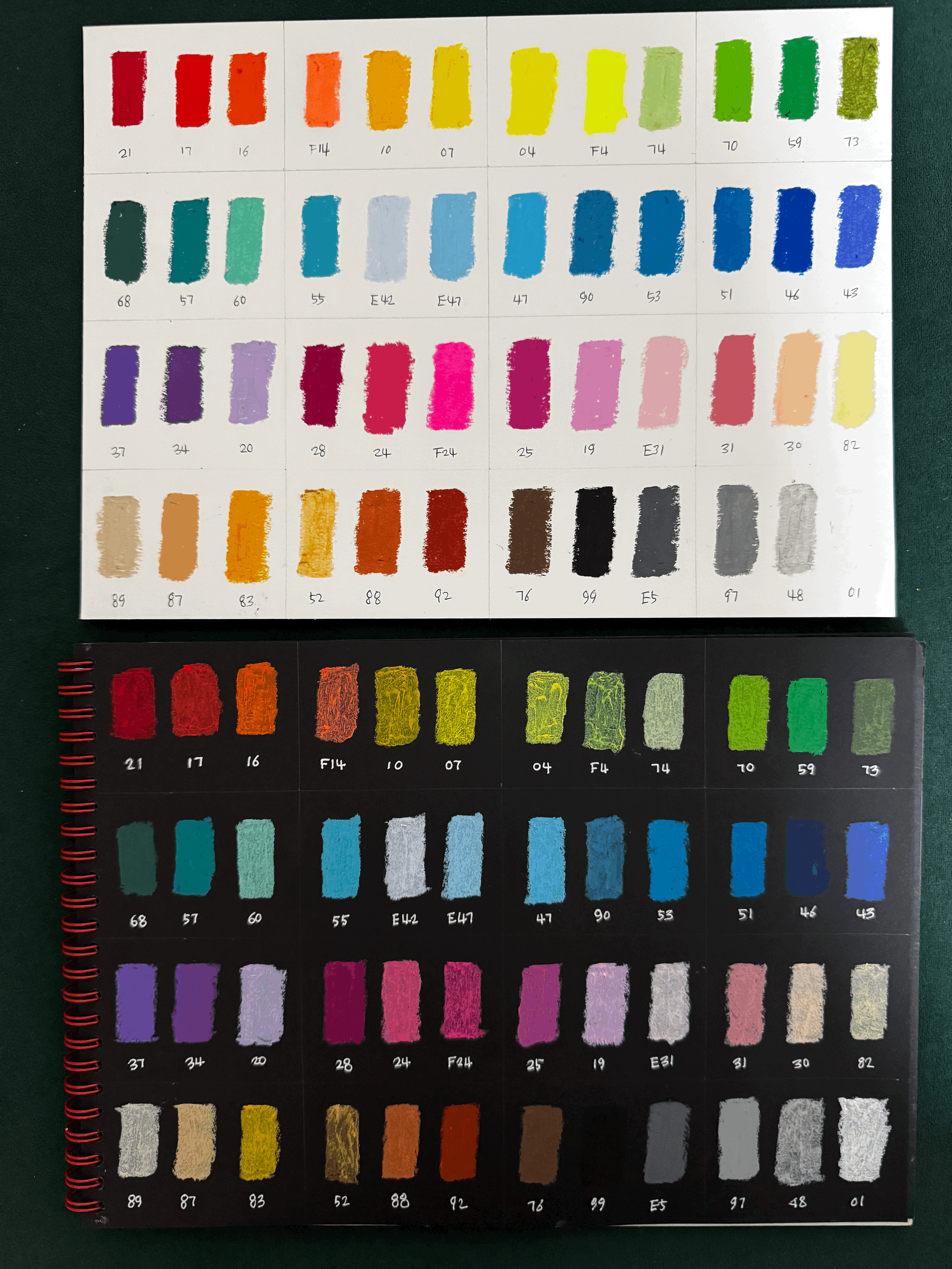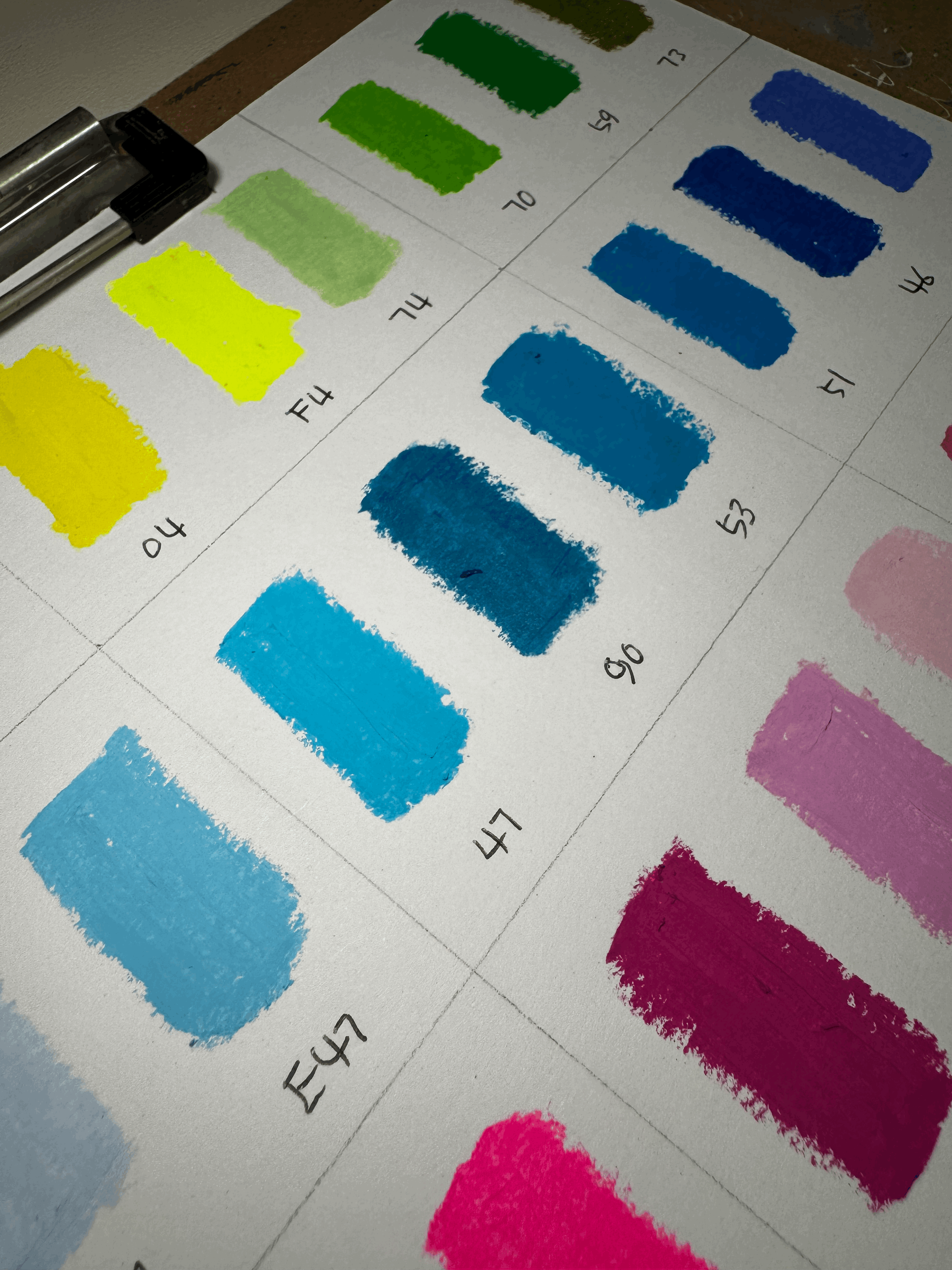 흰 종이 위에도 색상표를 만들어 봤는데 확실히 검은 종이 위에 사용했을때 색의 대비가 분명하여 더 쨍한 느낌이 들었어요.