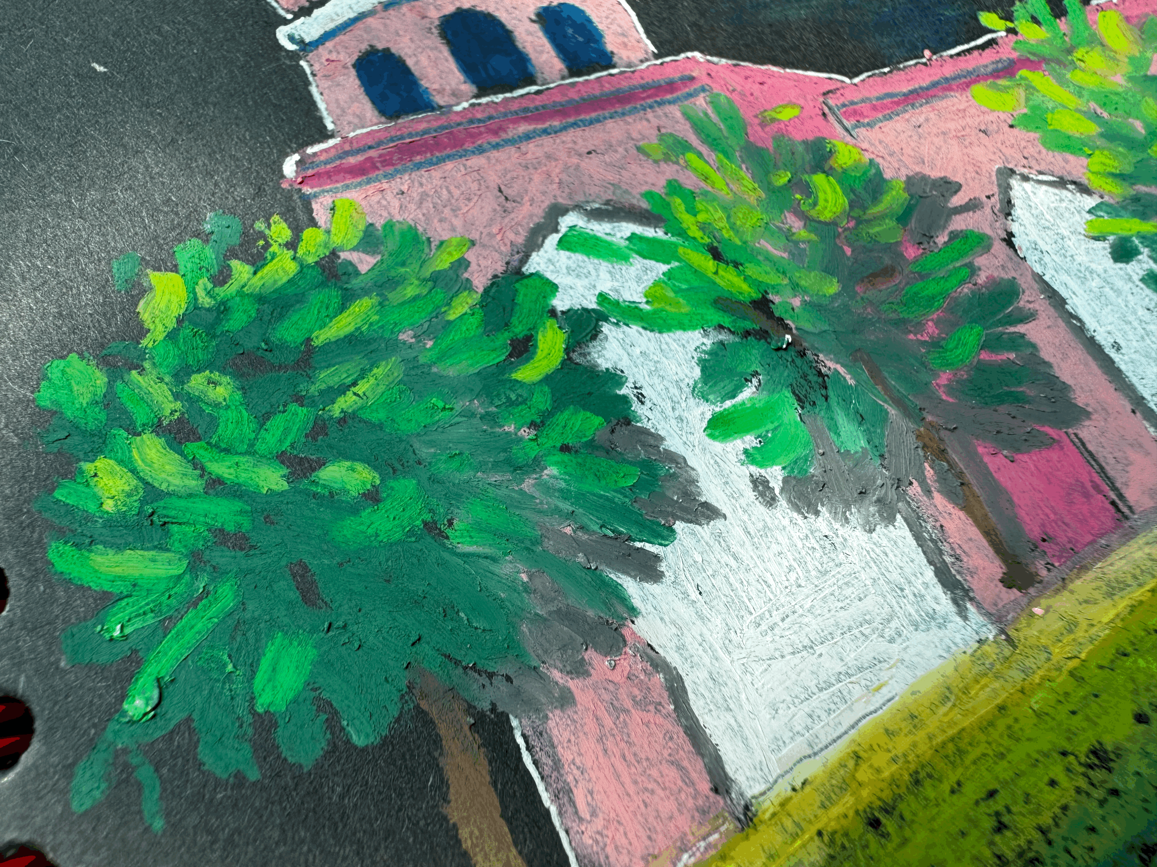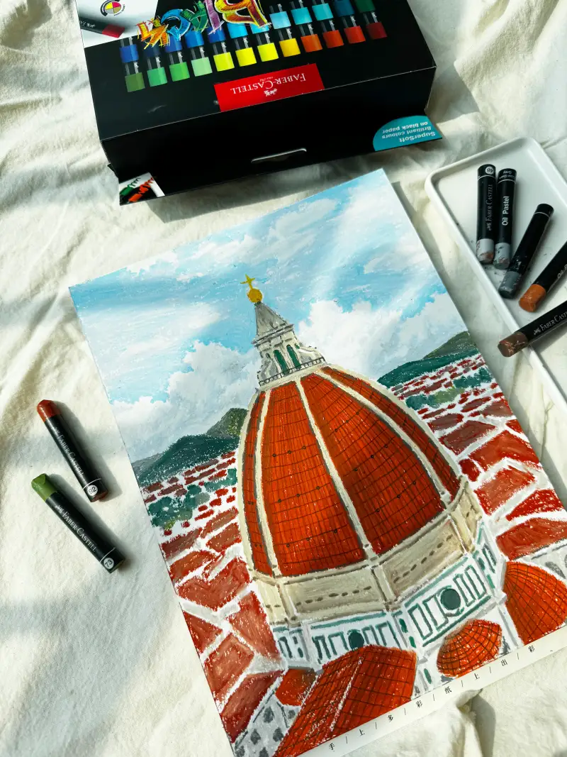 이번에는 하얀종이 위에 파버카스텔 블랙에디션 오일파스텔을 사용해봤어요. 낮의 풍경을 그릴 땐 흰종이가 편하지요 ^^ 색이 선명하고 높은 발광성 안료이지만, 색을 덫발라 표현하면 충분히 차분한 느낌도 낼 수 있답니다. 기본값이 차분이면 색을 맑게 끌어올리긴 힘들잖아요. 두가지 표현이 모두 가능한 오일파스텔이에요.