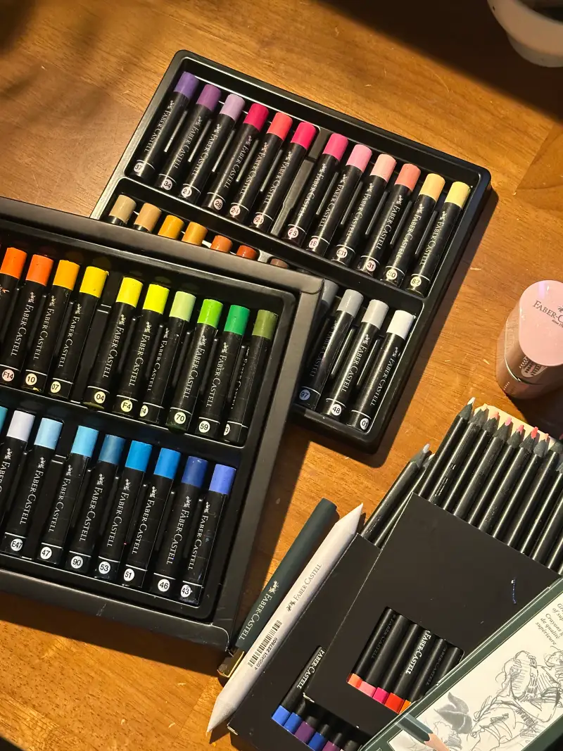 구성은 블랙에디션 48색 오일파스텔, 블랙에디션 색연필 36색, 골드파버 스케치 마카 24색, 색연필 익스텐더, 카스텔 9000 연필 6개 세트, 분홍색 트리오 연필깎이와 찰필까지 알차게 들어 있어 하나씩 보는 재미가 있었어요.