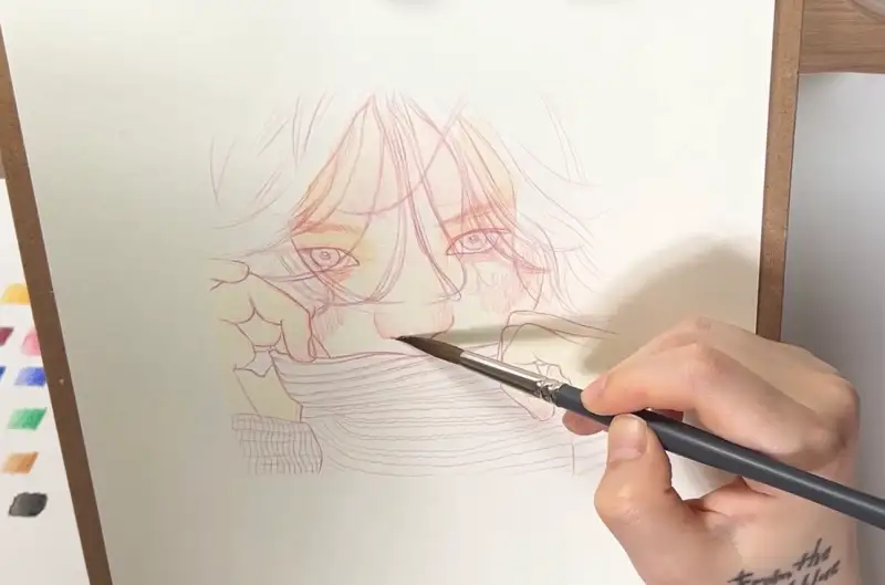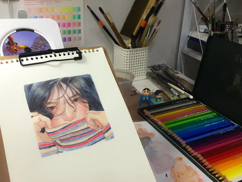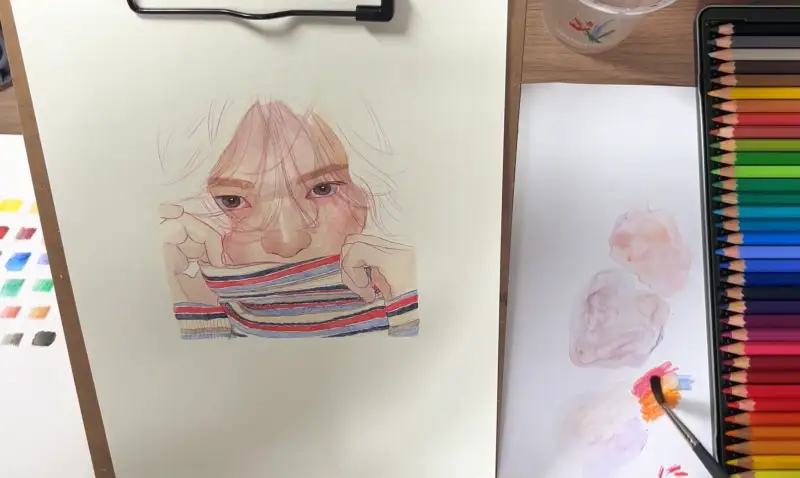 36색 단독으로 인물화 그리기엔 조금 한정적이라, 종이 팔레트에 따로 여러가지 색연필을 칠해 물로 섞어서 사용했어요. 물감으로 색을 조합하는 것처럼 색이 잘 섞여서 36색으로도 충분히 작업할 수 있었답니다.
