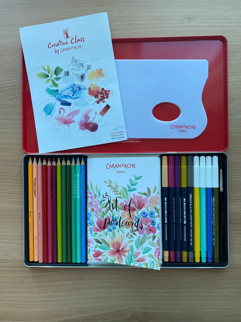 12색 수성색연필 (슈프라컬러), 5색 브러쉬 펜 (피블라로), 4색 팁 펜 (피블라로), 1개 화이트 팔렛트, 1개 엽서북, 1개 5호 수채화 붓.