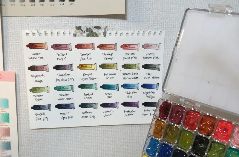 홀베인 특유의 쨍한 채도들도 너무 마음에 들었습니다. 24색 중에서도 버크스 패럿 핑크, 트와일라잇 퍼플, 오션 블루 컬러가 최애픽! 일반 수채화 물감에서는 볼 수 없는 색들이어서 좋았어요.