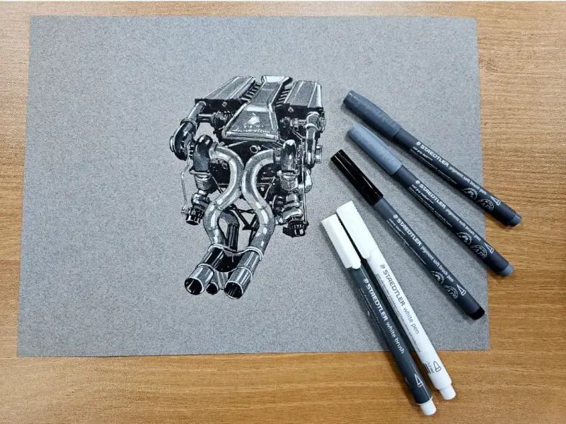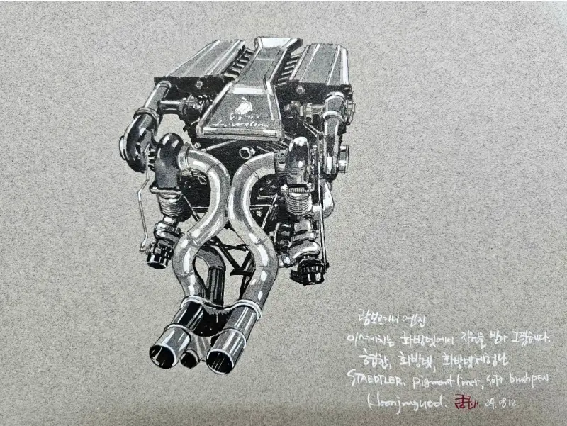 피그먼트 소프트 브러쉬펜과 화이트펜을 사용하여 그레이톤의 파스텔지위에 람보르기니 엔진을 표현했습니다.