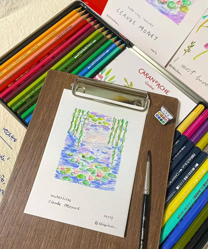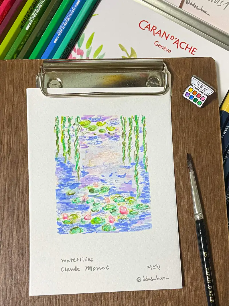 그래서 모네의 수련을 간단하게 그려보았어요 브러시타입 펠트펜으로 아래에 글씨도 적어주었답니다