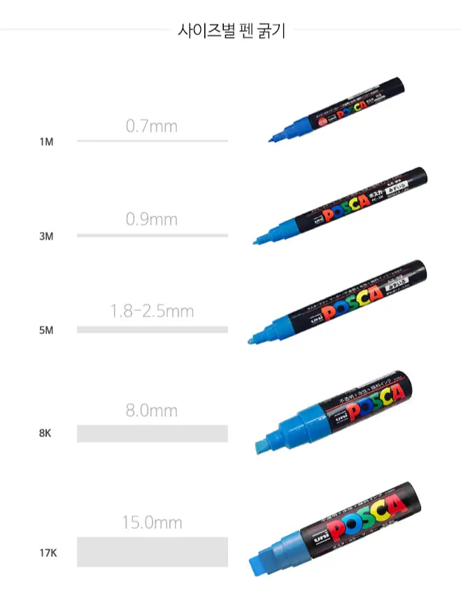 펜 끝이 잘 마르지 않고, 0.5mm, 0.8mm, 1.0mm의