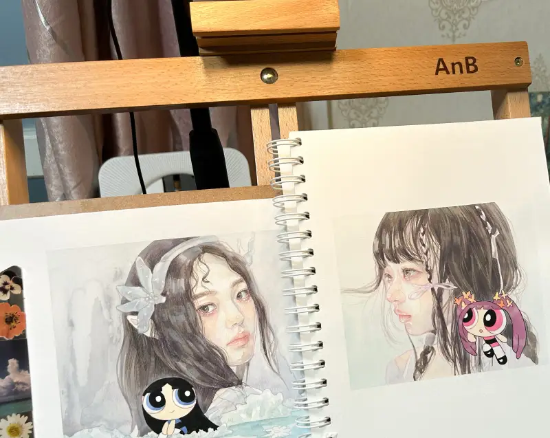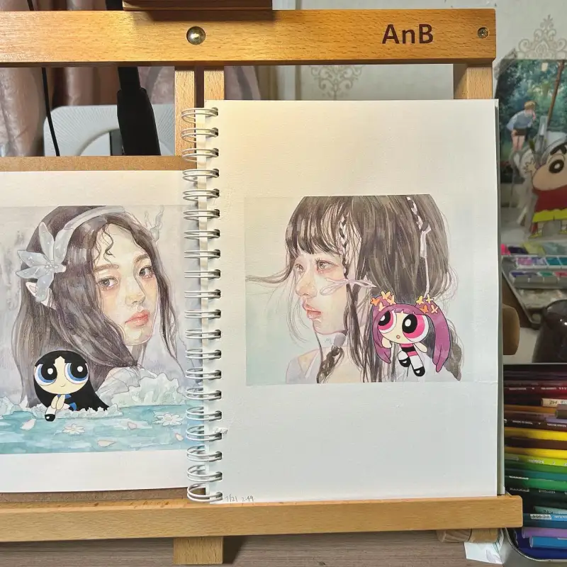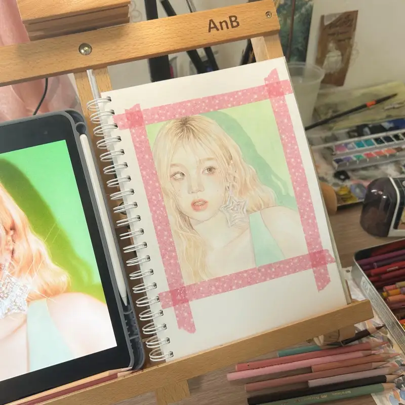 인물화를 그릴 때 필수인 인물 사진 자료! 저는 아이패드를 보며 그림을 그리는데, 테이블 이젤의 크기가 넉넉해 자료와 그림을 나란히 놓고 볼 수 있어 좋았습니다. 또, 자주 쓰는 색연필이나 붓 같은 재료들을 올려둘 수도 있어요!
