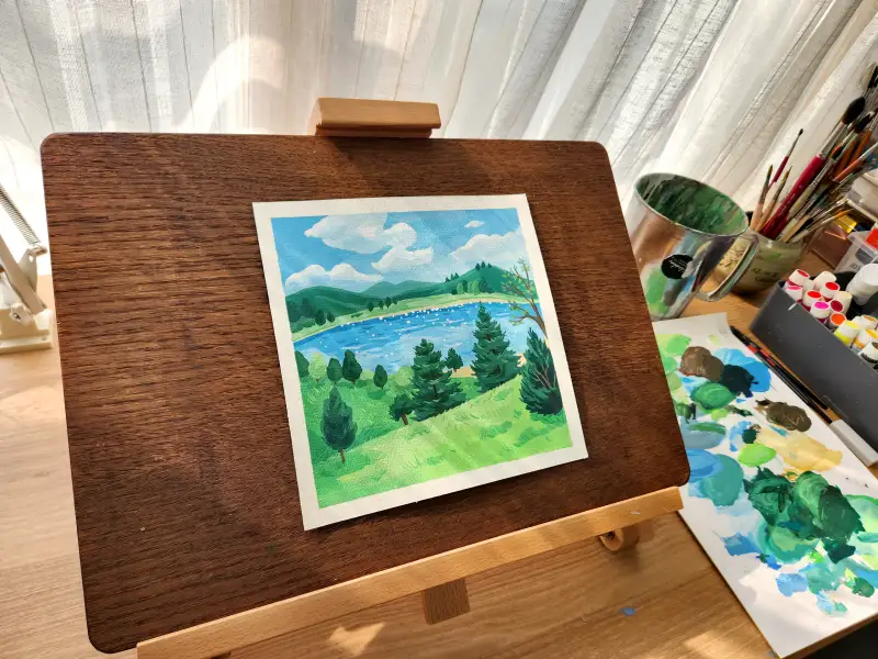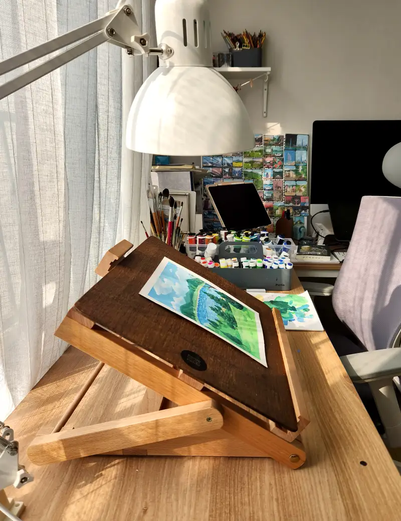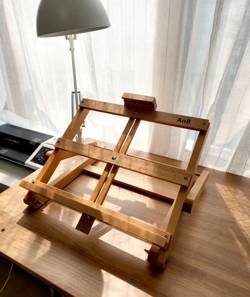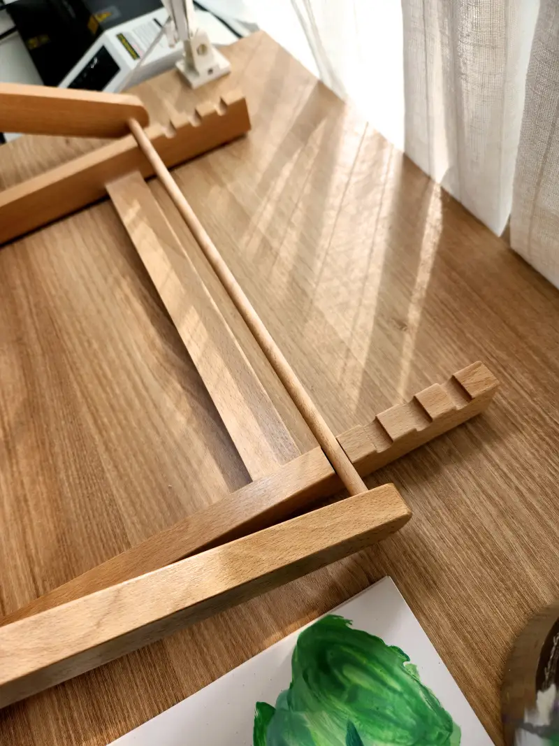 4단계 각도 조절이 가능하고 높이 조절도 돼서 화판을 세로로 놓고 긴 그림을 그릴 수도 있어요. 화판 올려두는 곳에 깊이가 여유로워서 캔버스 작업도 충분할 것 같아요.