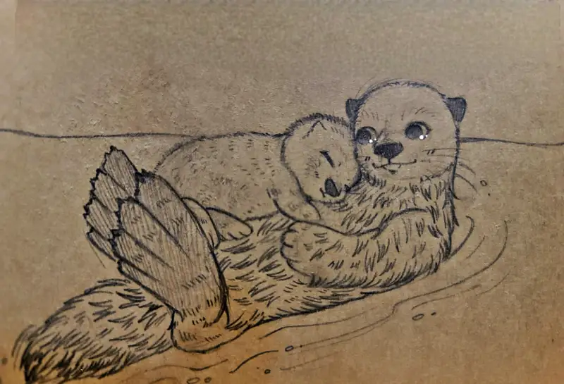 잉크토버 작업으로 그린 작품으로, shallow (얕은, 피상적인) 라는 단어를 보고 카페에서 그린 그림입니다. 엄마 해달과 아기 해달이 얕은 물 위를 떠다니며 엄마 해달이 아기에 대한 사랑을 표현하는 모습을 그려보았습니다.